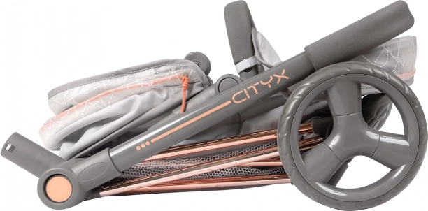 El cochecito de juego para muñecas 3 en 1 de la colección CITY X reproduce fielmente los cochecitos infantiles modernos. Combina tejidos de calidad con PVC translúcido con efecto “cristal” y elegantes acentos cobrizos. Gracias al capazo desmontable, que puede colocarse a favor o en contra de la marcha, y a la posibilidad de convertirlo en asiento deportivo, los niños disfrutarán de un juego realista y cómodo.