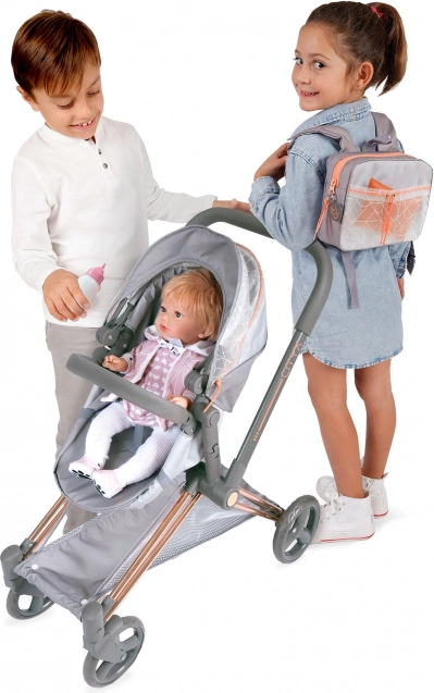El elegante cochecito para muñecas 3 en 1 de la colección CITY X destaca por su moderno diseño gris y cobrizo, capazo desmontable, capota ajustable y ruedas delanteras giratorias para un manejo fácil. Ofrece estructura plegable, arnés de tres puntos, práctico cesto de almacenaje y mochila con bolsillo transparente, ideal para niños a partir de 3 años.