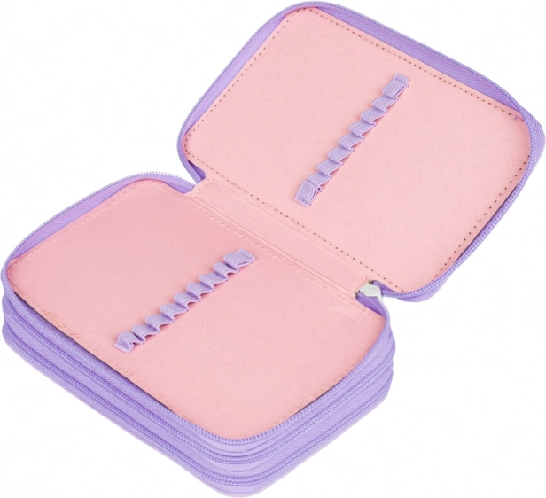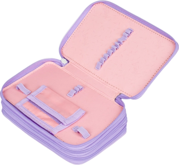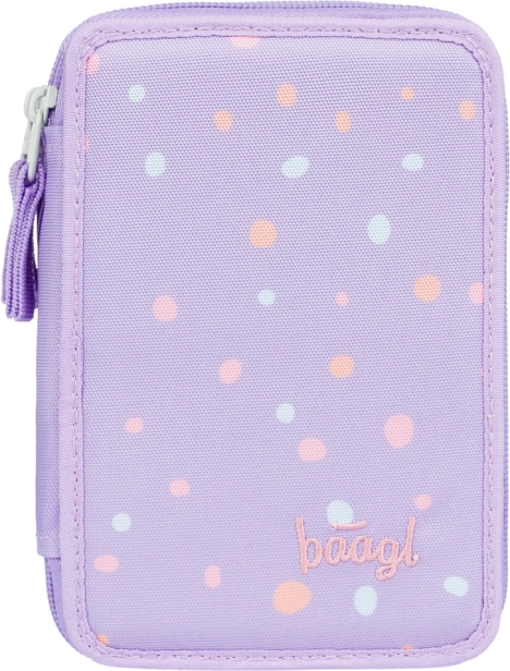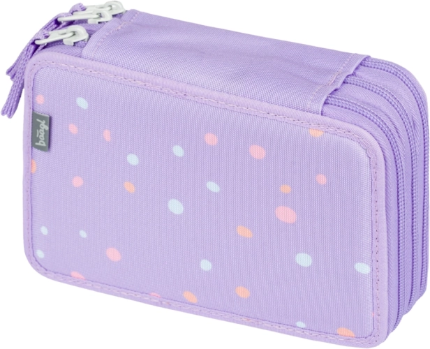 Las ingeniosas gomas elásticas están diseñadas para alojar cómodamente incluso lápices y rotuladores más gruesos. El estuche está fabricado en material textil resistente y, gracias a su alegre diseño de lunares en tonos morados, complementa a la perfección cualquier set escolar. Se entrega sin contenido, para que lo personalices exactamente a tu gusto.