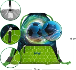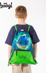 Práctica bolsa deportiva de Baagl para calzado y actividades de ocio con motivo de balón de fútbol. Ofrece material resistente y lavable, cierre mediante cordones para llevar a la espalda, mosquetón para sujetar a la cartera escolar y bolsillo inferior con cremallera para pequeños objetos.