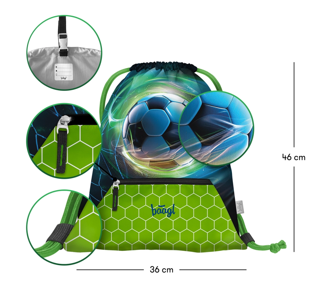La bolsa Baagl con diseño de balón de fútbol es estilosa y funcional, ideal para la escuela, el entrenamiento y el tiempo libre. El material resistente y lavable garantiza una larga vida útil y un mantenimiento sencillo, mientras que los cordones permiten un transporte cómodo a la espalda.