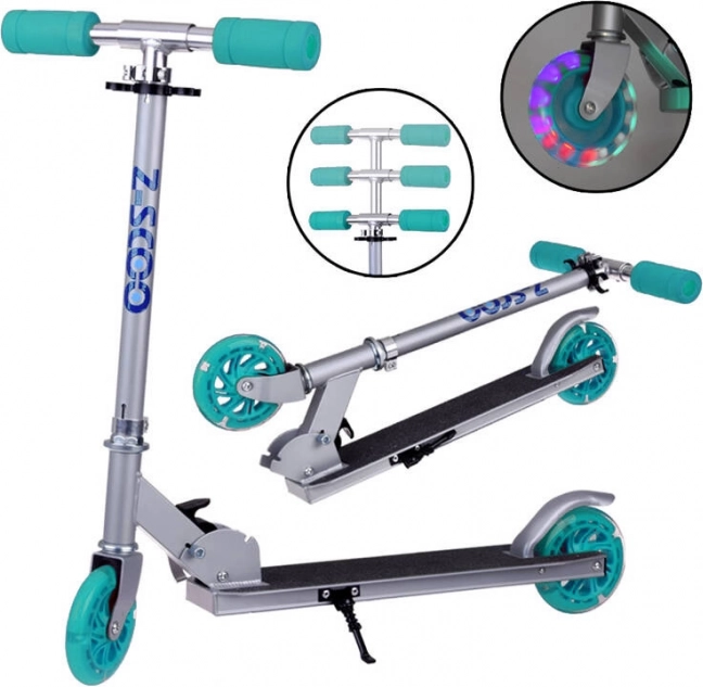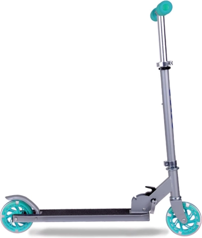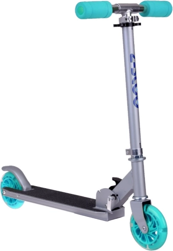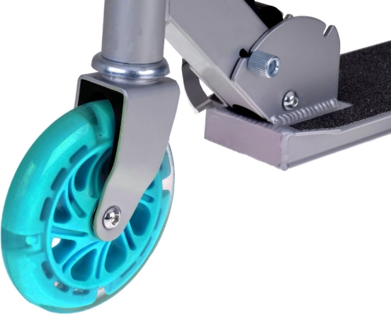 Este patinete infantil plegable combina bajo peso, una estructura metálica robusta y un diseño divertido con detalles en turquesa. Gracias a las ruedas LED, que se iluminan al rodar y no requieren baterías, el niño es más visible y cada paseo es más entretenido.