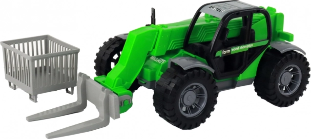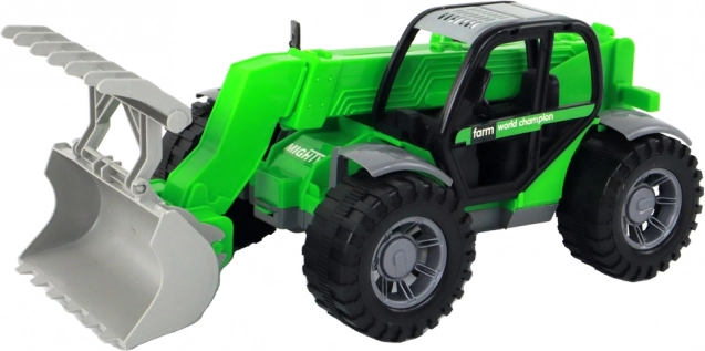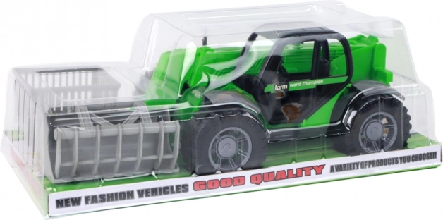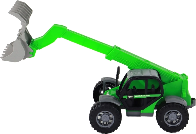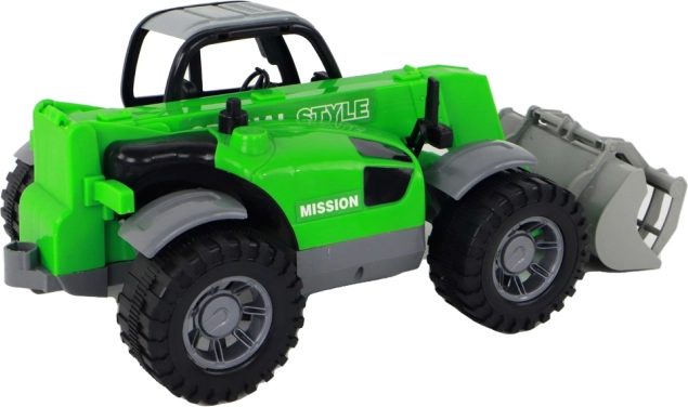 Robusto tractor verde para niños con brazo extensible y tres accesorios intercambiables que ofrece un juego realista en casa y al aire libre. Gracias al impulso por fricción, las ruedas grandes y la cabina transparente, desarrolla la motricidad y la imaginación. Incluye horquilla, cesta y pinza para madera para distintos tipos de carga y transporte.
