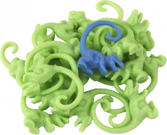 Pequeñas figuritas de dinosaurios de plástico se colocan sobre los palitos y van cayendo durante la partida: el objetivo es recoger la menor cantidad posible.