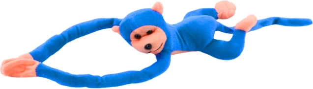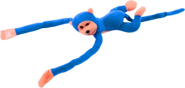 Adorable mono de peluche en color azul de 80 cm, el compañero ideal para abrazar y jugar. Tiene extremidades largas con prácticas tiras de velcro para fijarlo fácilmente a la mano o a los muebles y, al presionar la barriguita, emite un sonido. El material es suave y delicado, y cuenta con certificación CE según la EN71, para alegría de padres y niños a partir de 3 años.