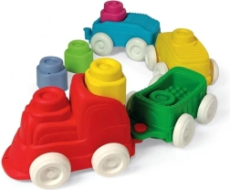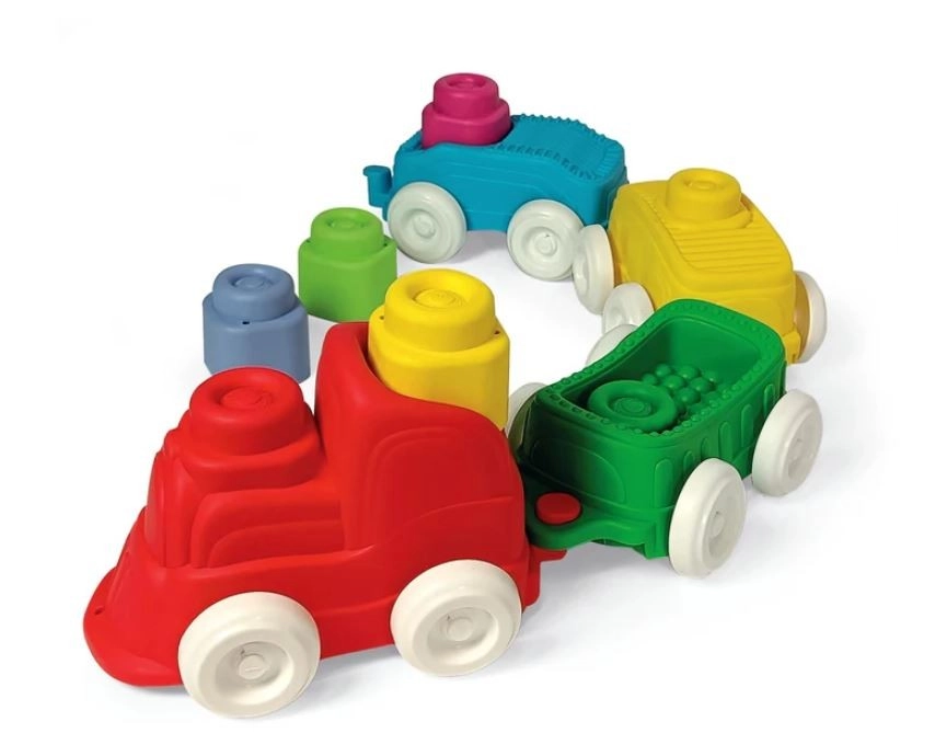 La locomotora y los tres vagones se conectan y separan fácilmente, para que los niños puedan crear sus propios trenes. Las ruedas permiten un desplazamiento fluido del tren, lo que favorece el juego activo y el desarrollo de la imaginación. Los bloques se pueden introducir en los vagones o apilar en torres estables: ideal para las primeras construcciones y chimeneas.
