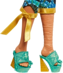 La muñeca Cleo De Nile se prepara para el evento musical más candente del año: Monster Fest. Destaca con un top de mangas doradas, pantalones en colores joya y una corona con motivo de loto que realza su larga melena azul. Gracias a sus articulaciones, podrás ajustar poses geniales para fotos y juego imaginativo.
