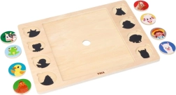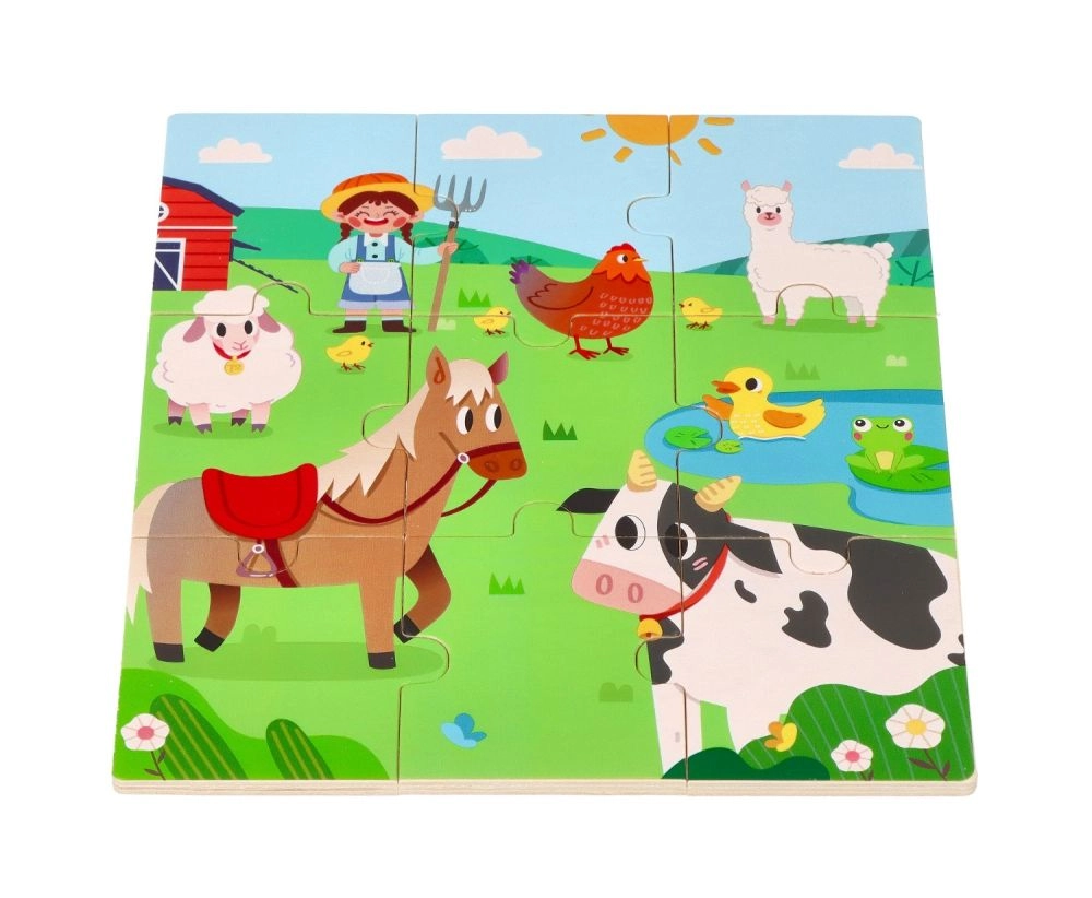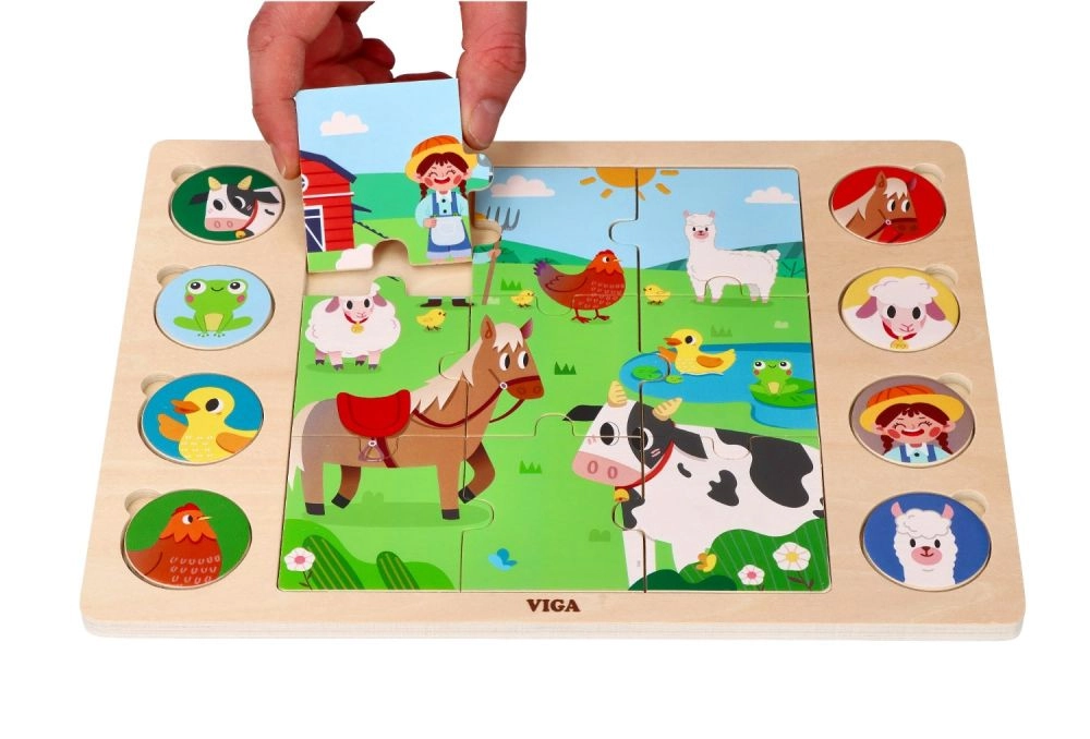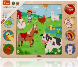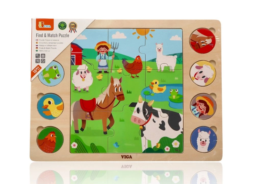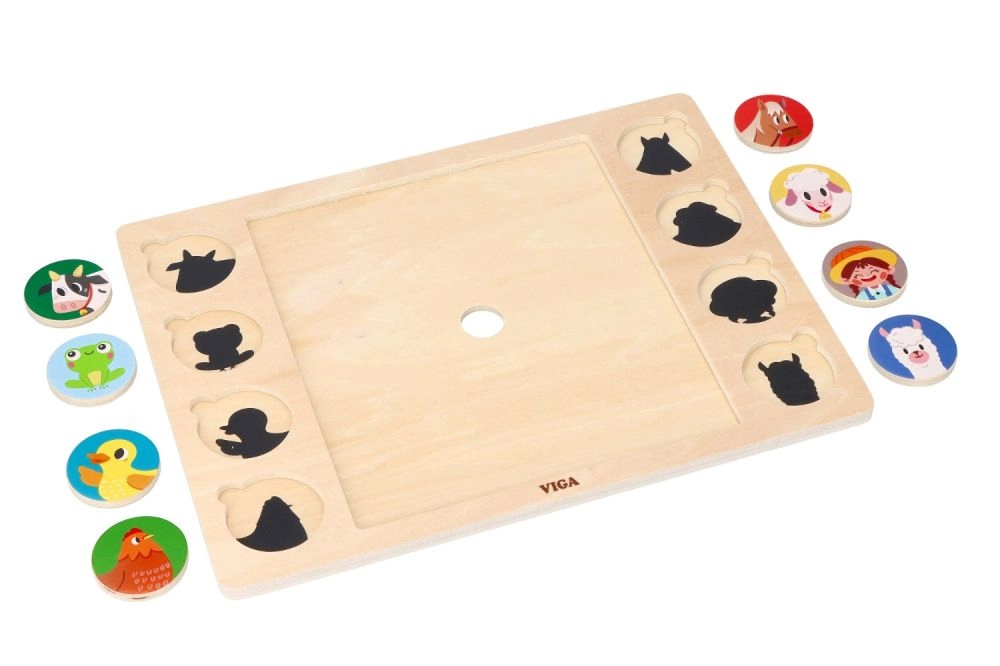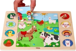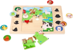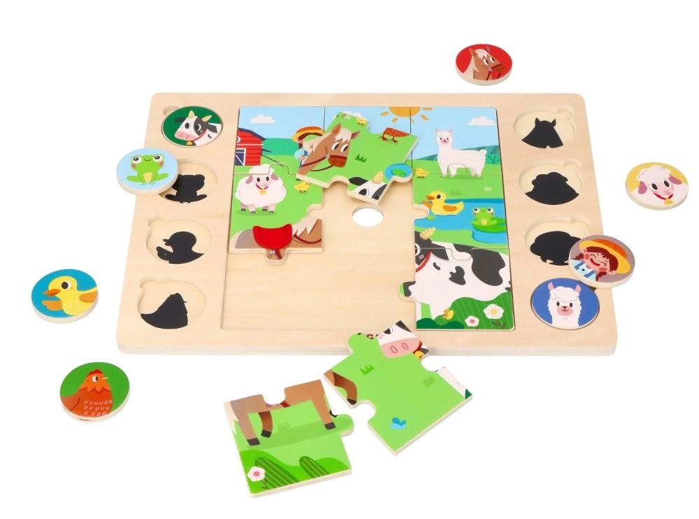 Este ingenioso rompecabezas une dos actividades: primero los niños montan la imagen central con 9 piezas grandes y después asignan 8 fichas redondas con animales a las sombras correspondientes en el tablero. El juego apoya de forma natural el desarrollo del vocabulario: al terminar, los niños pueden nombrar los animales y buscarlos en la gran ilustración de la granja.