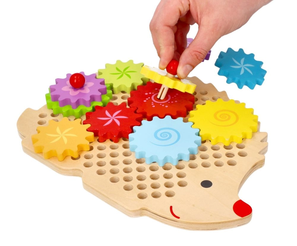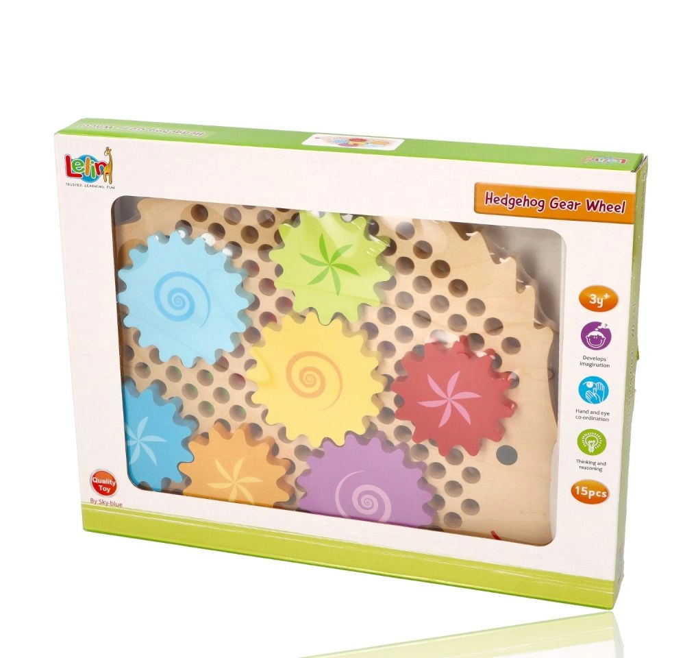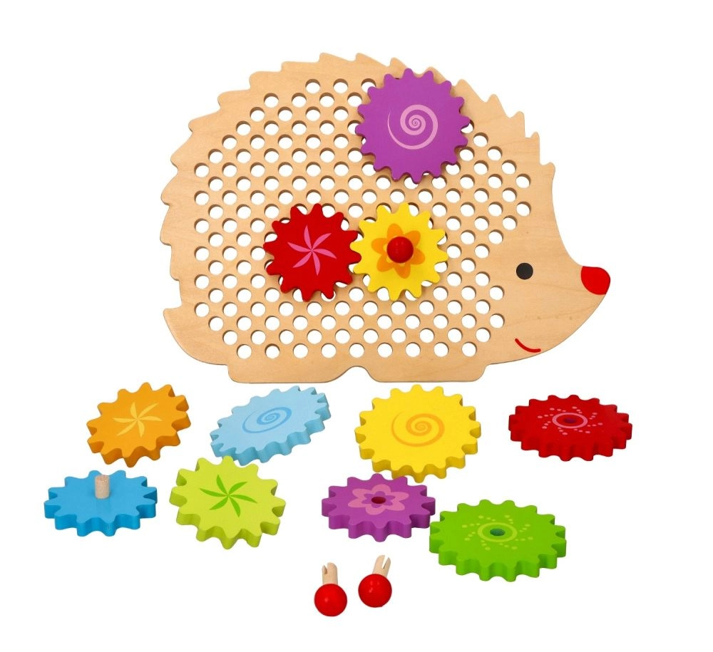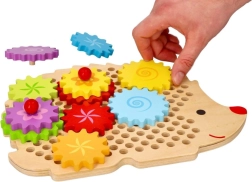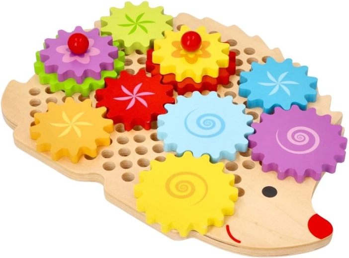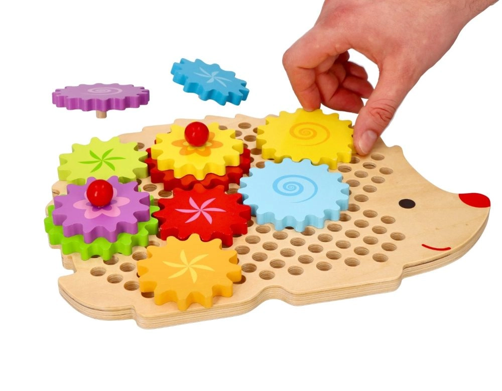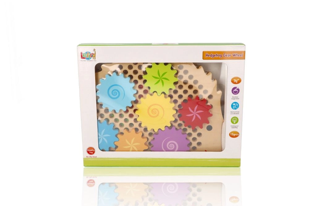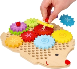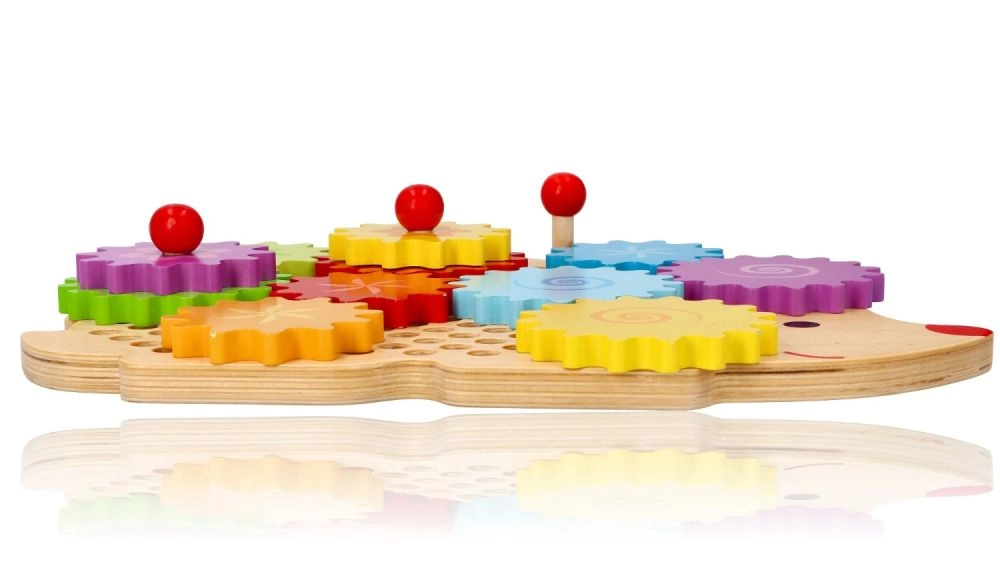 El rompecabezas de madera con forma de erizo y engranajes de colores vivos fomenta el aprendizaje temprano a través del juego. Los niños pueden colocar las ruedas en los pernos, probar diferentes combinaciones y ver cómo giran todos los engranajes. Esto refuerza el pensamiento lógico y explica de forma natural los principios de causa y efecto.