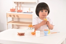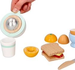 Este cuidado juego de desayuno de madera es ideal para las primeras aventuras en la cocina. Los niños preparan su propio desayuno: desde cortar el pan hasta exprimir un zumo fresco. Los detalles realistas y los agradables colores pastel invitan al juego y estimulan la imaginación.