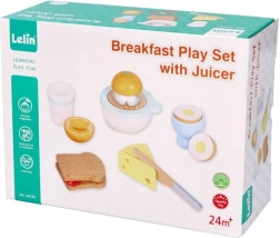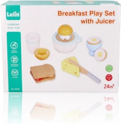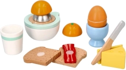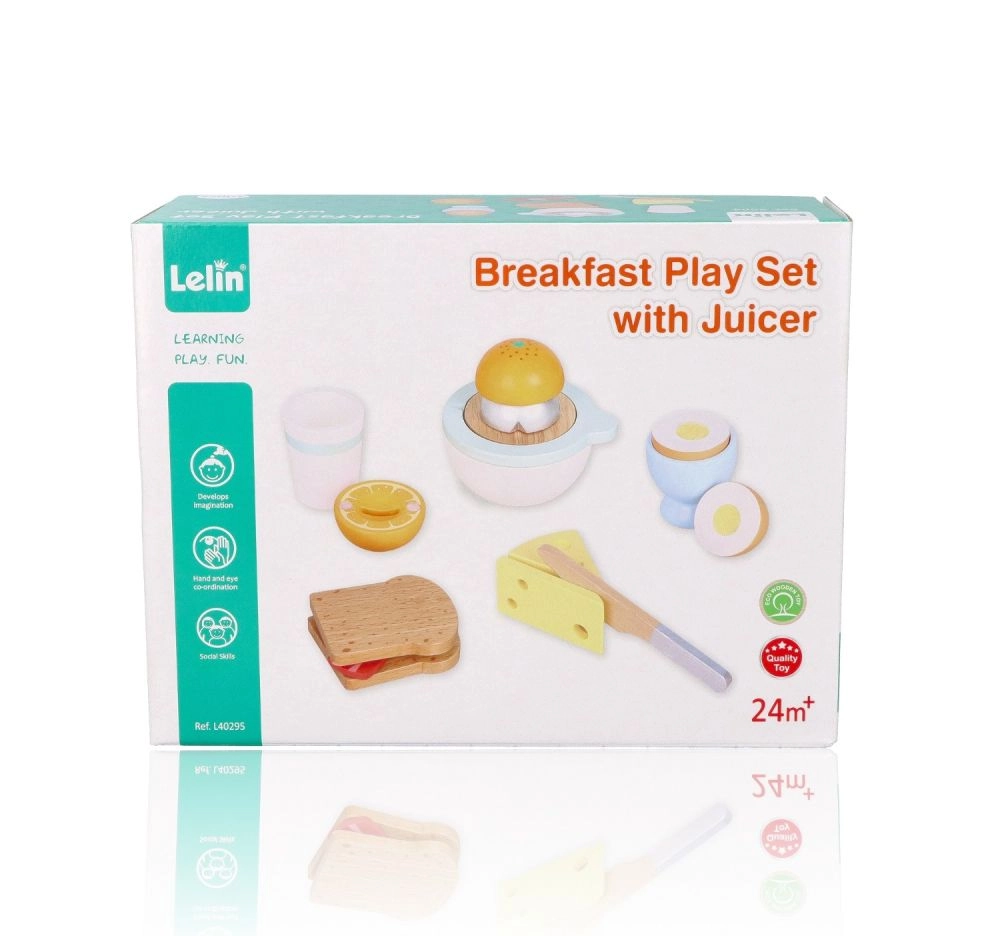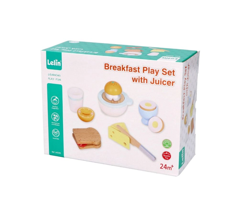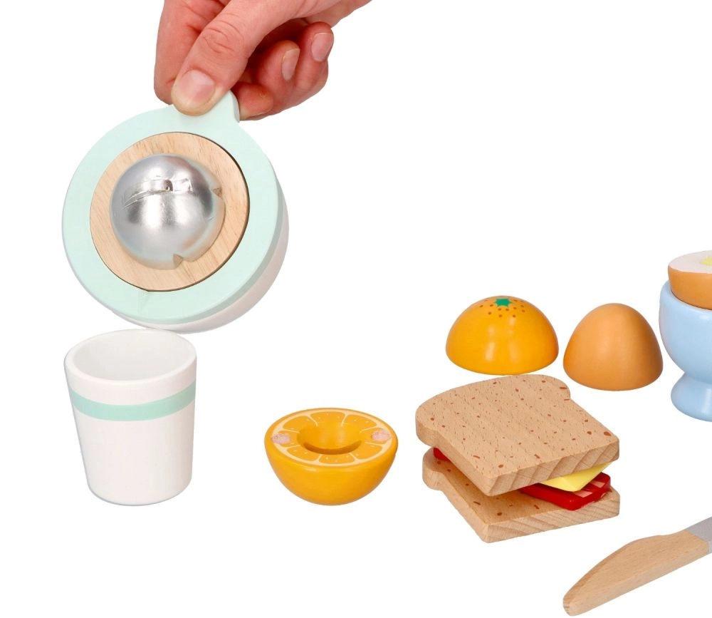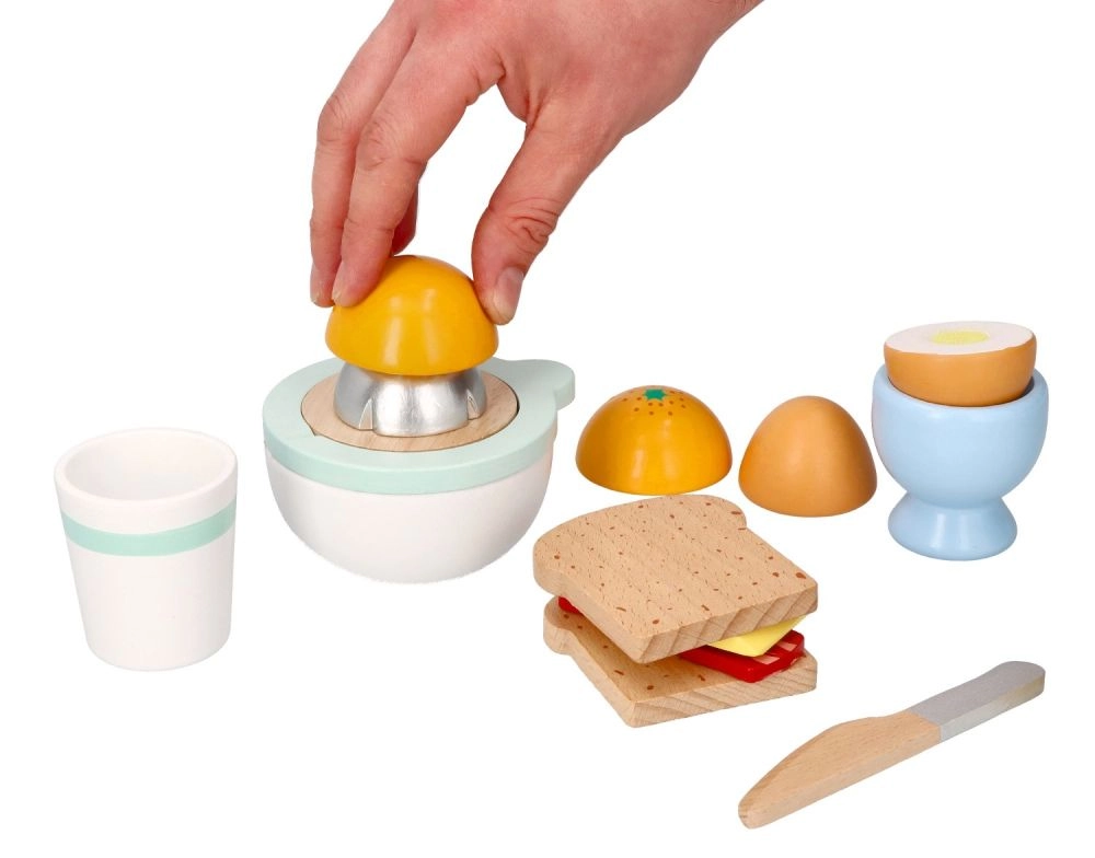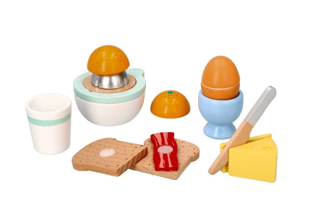 Juego de desayuno de madera para pequeños cocineros que incluye todo para un juego de cocina realista: tostadas, huevo en huevera, queso, exprimidor manual con naranja, taza y un cuchillito de madera seguro. A partir de 24 meses, fomenta la motricidad fina, la creatividad y el juego de roles con una fabricación de calidad y resistente.