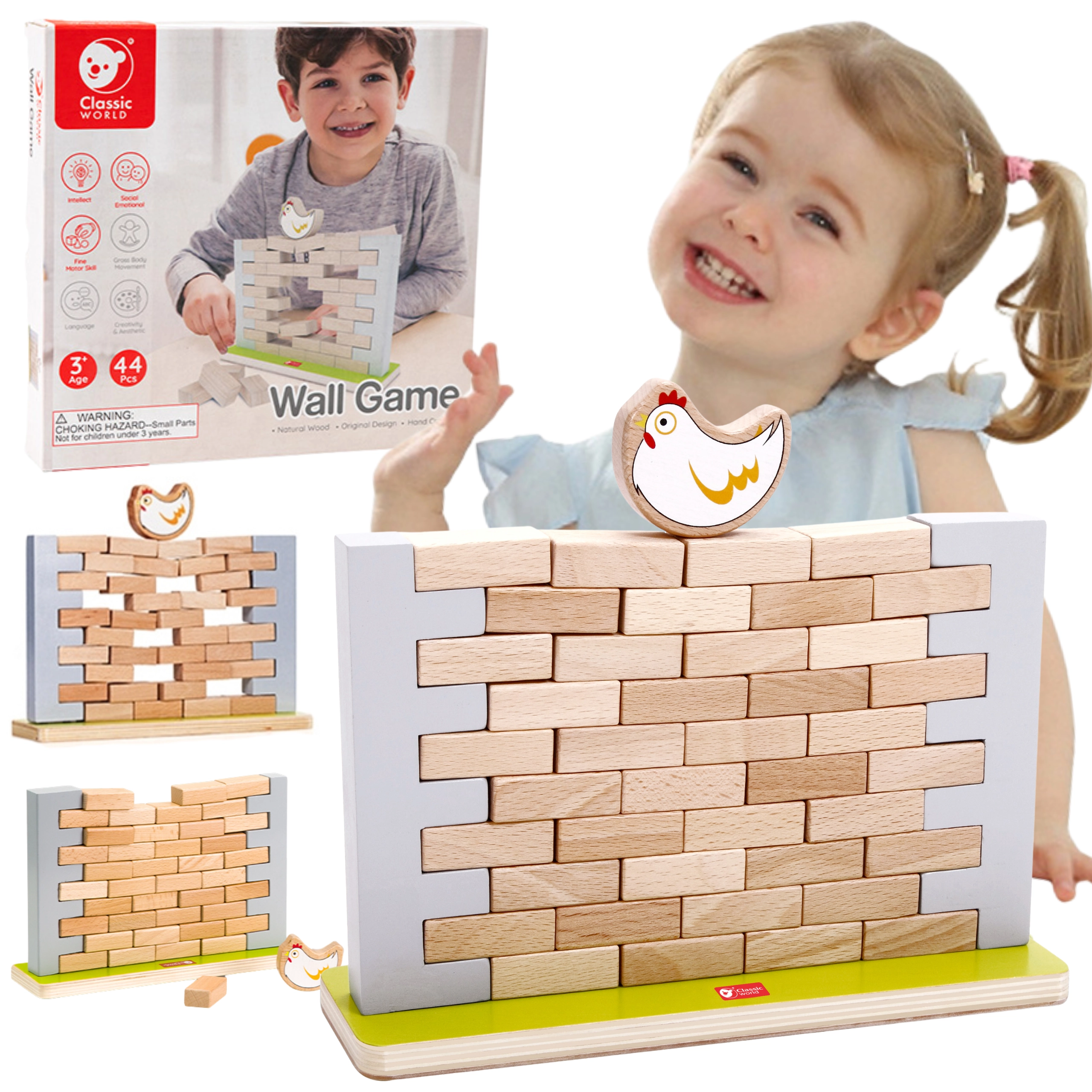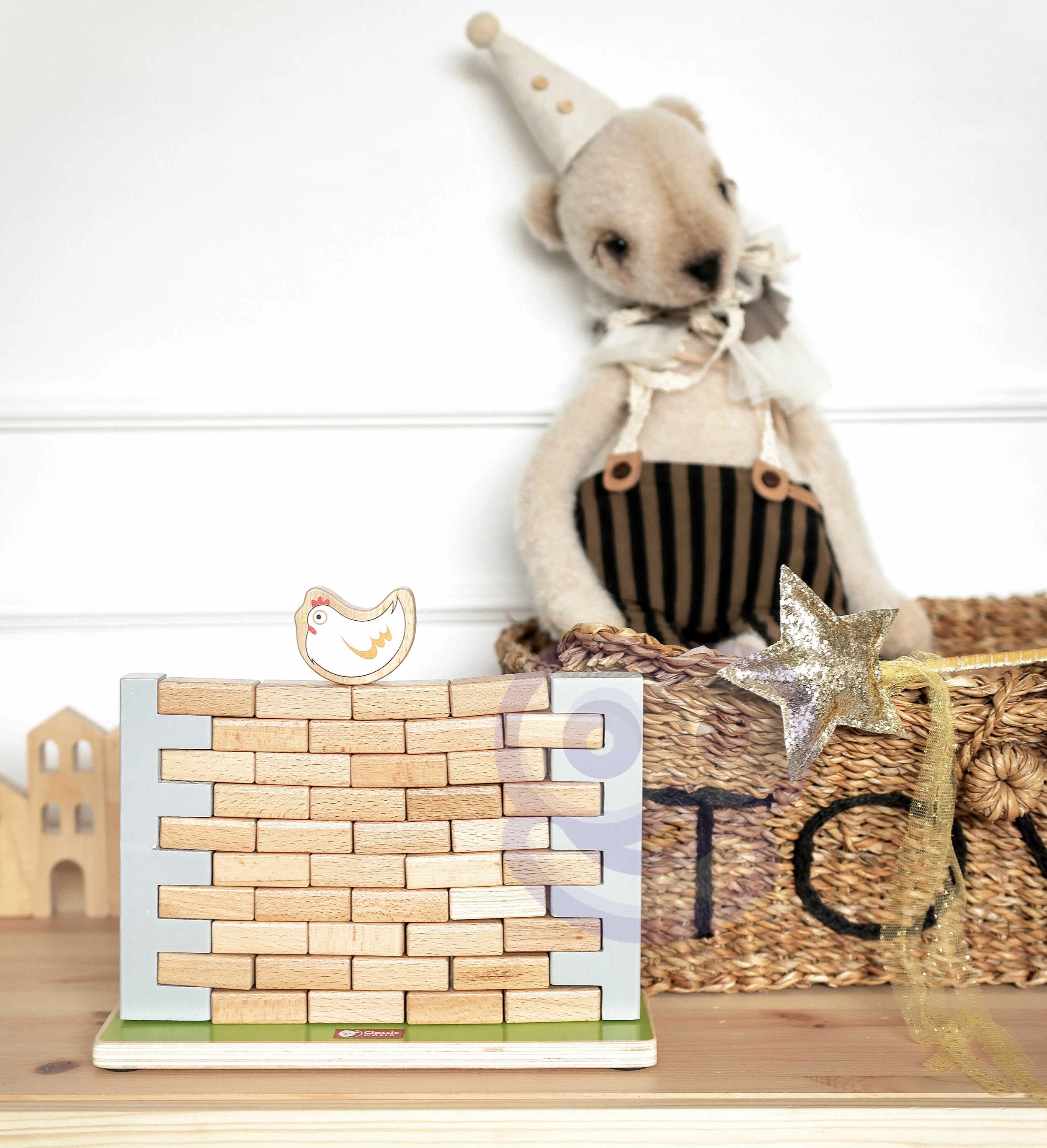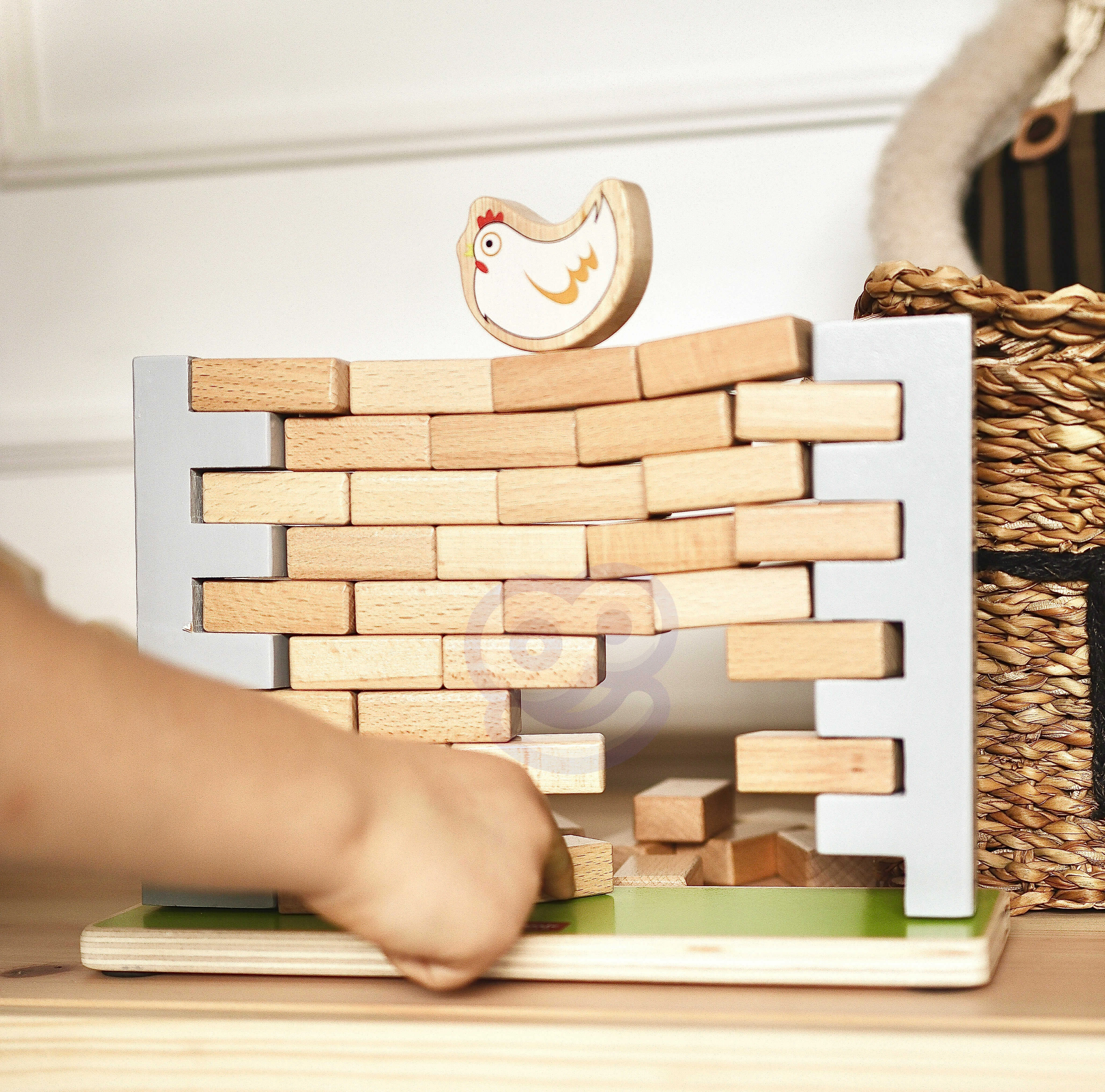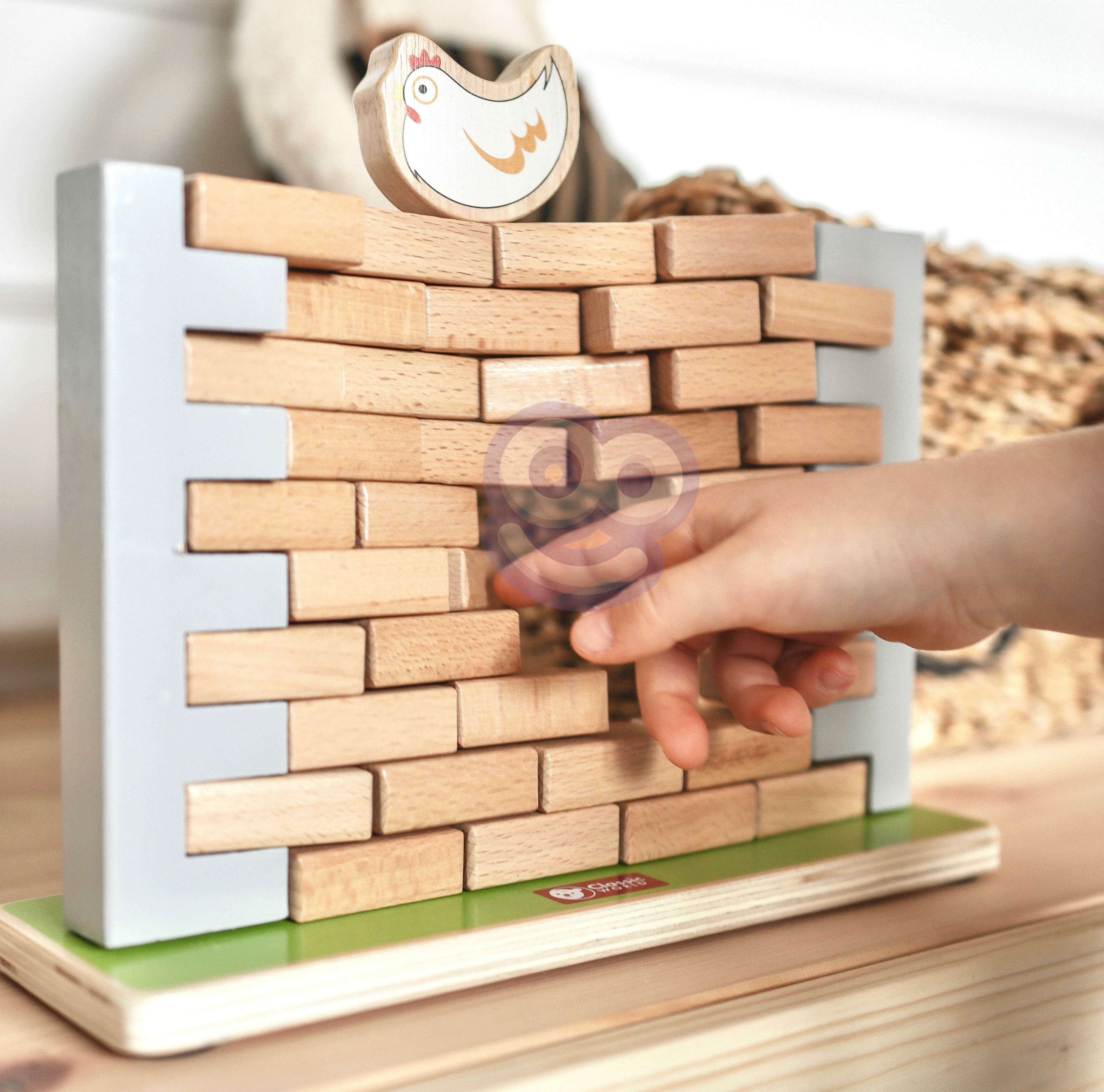Este juego de equilibrio de madera de alta calidad ofrece reglas sencillas y mucha emoción. El objetivo es sacar los ladrillos del muro sin que caiga la gallina situada en la parte superior. Los niños practicarán la paciencia, la concentración y la resolución de problemas mientras se divierten con padres o hermanos.