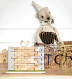 El set incluye 44 piezas de madera natural: una base estable, 2 laterales, una figura de gallina y 40 ladrillos. El juego viene en una caja elegante, perfecta como regalo. Los materiales utilizados son duraderos, seguros y agradables al tacto.