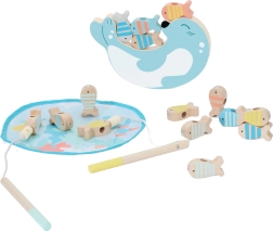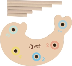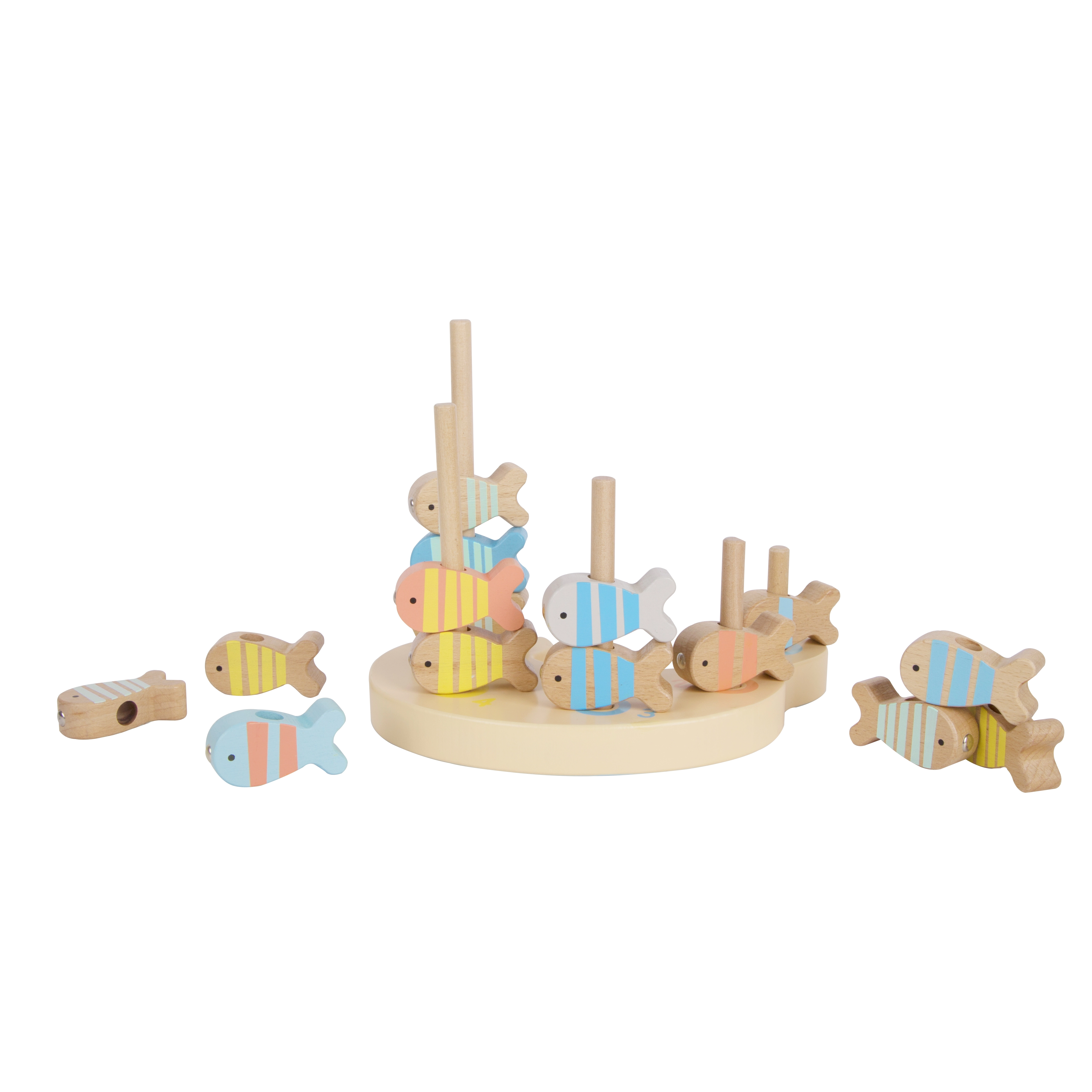 Coloca los peces capturados en los postes según colores, patrones o número de orificios. El juego fomenta el pensamiento lógico y los primeros cálculos.