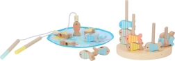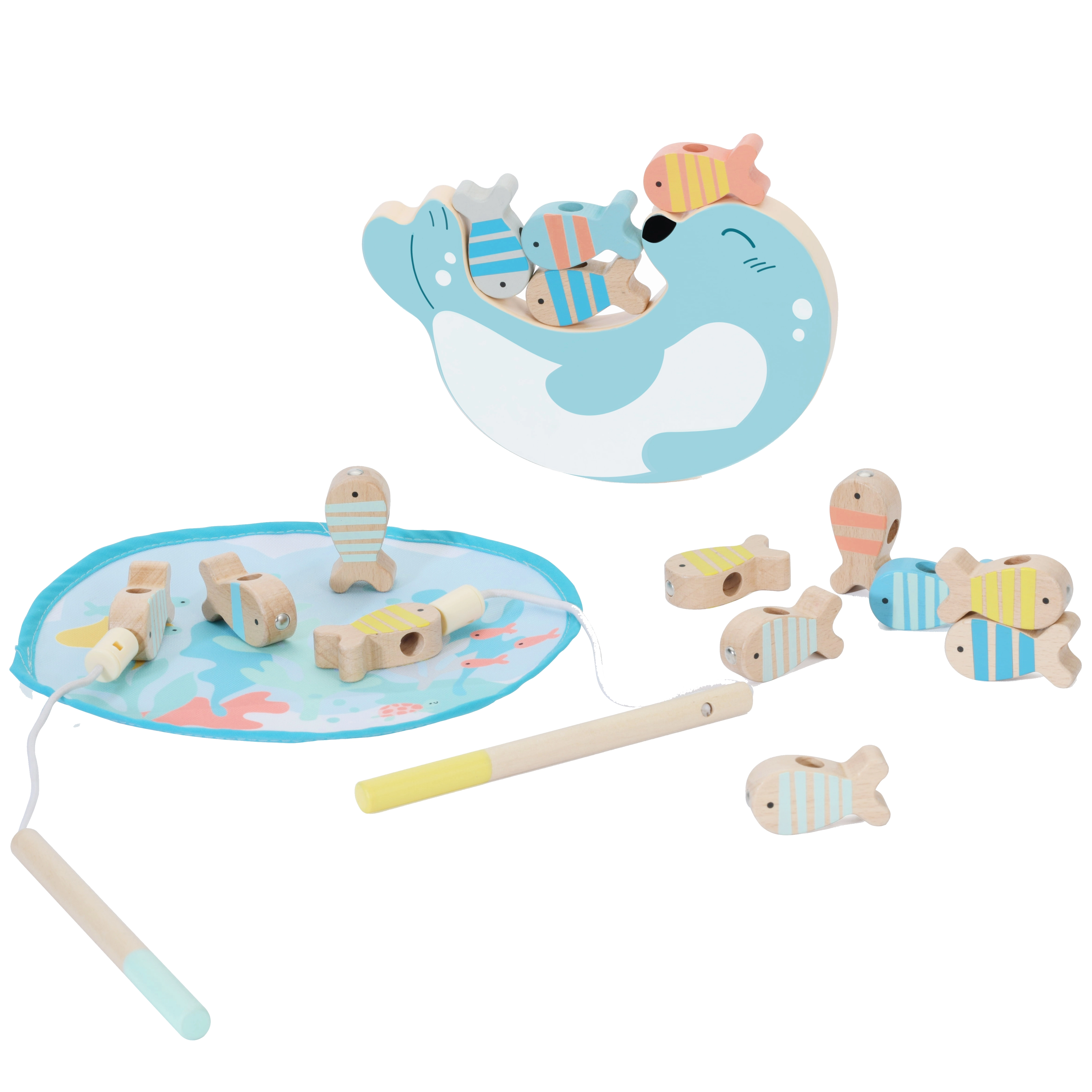 El set incluye todo lo necesario para jugar de inmediato: peces, 2 cañas, una base de juego “estanque” y una figura de equilibrio. Seguro, resistente y agradable al tacto gracias a la madera natural y su acabado suave.