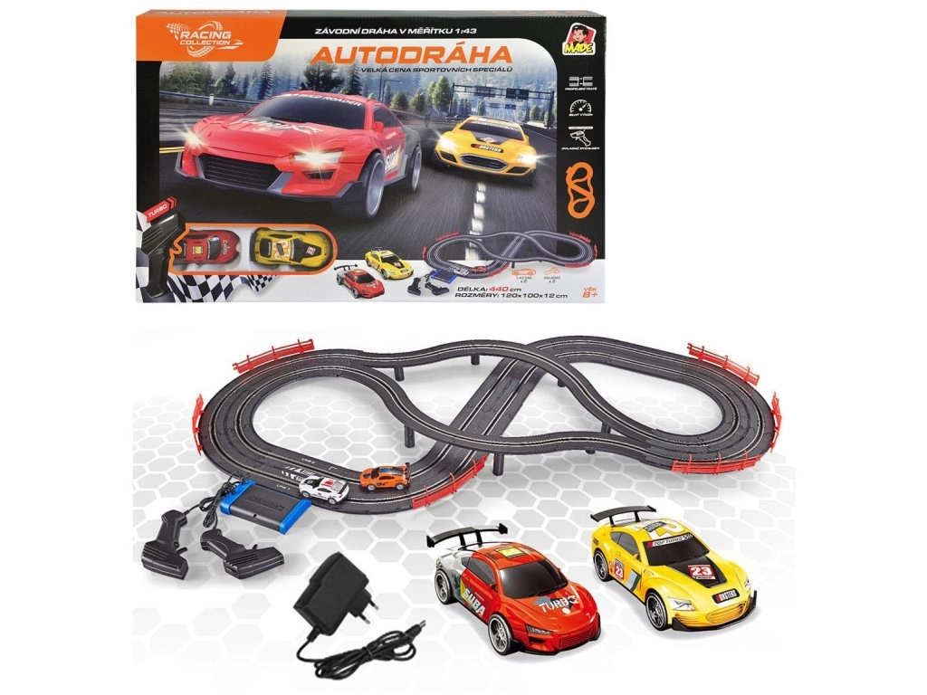 Disfruta de emocionantes carreras con la pista de la serie Racing Collection. El set incluye 2 coches de carreras, 2 mandos manuales, puente con accesorios y adaptador de corriente EU. La longitud total del circuito de 440 cm y las dimensiones del conjunto 120 × 100 × 12 cm garantizan mucha diversión para pequeños y grandes amantes de la velocidad.