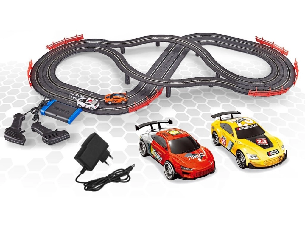 - 2 coches de carreras, 2 mandos, puente con accesorios, adaptador de corriente EU