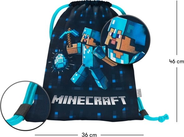 La estilosa bolsa MINECRAFT Blue Axe es ideal para la escuela, actividades y tiempo libre. Gracias a su material resistente y lavable, soporta el uso diario y se limpia fácilmente. Los cordones de cierre resistentes funcionan también como tirantes, para llevar la bolsa cómodamente a la espalda.