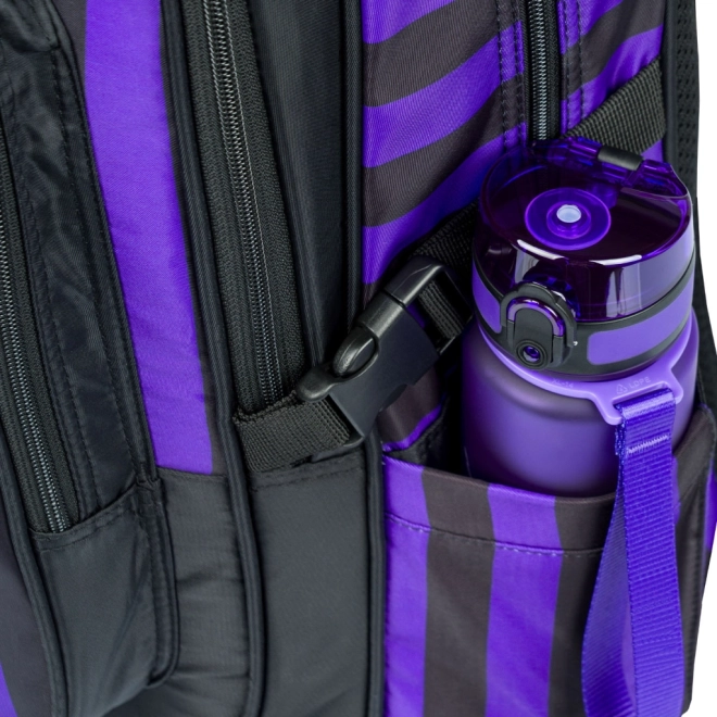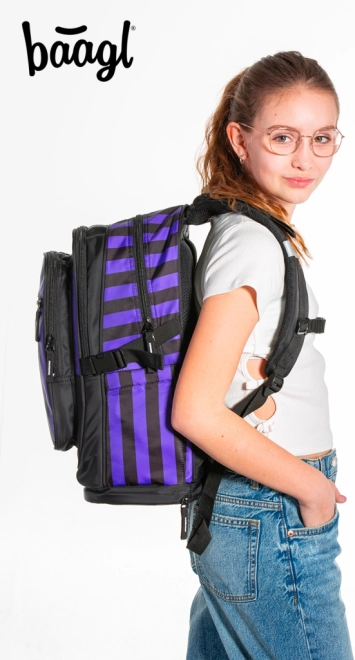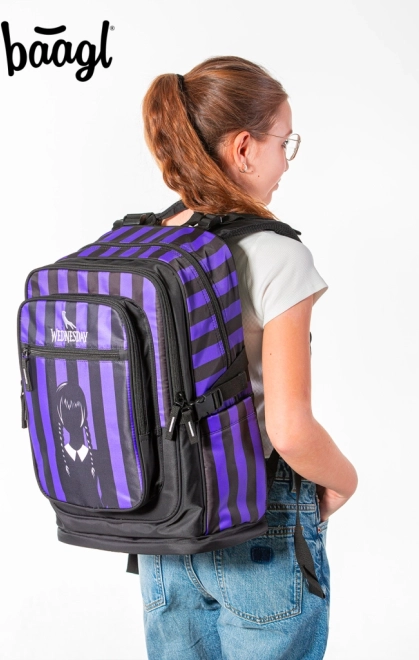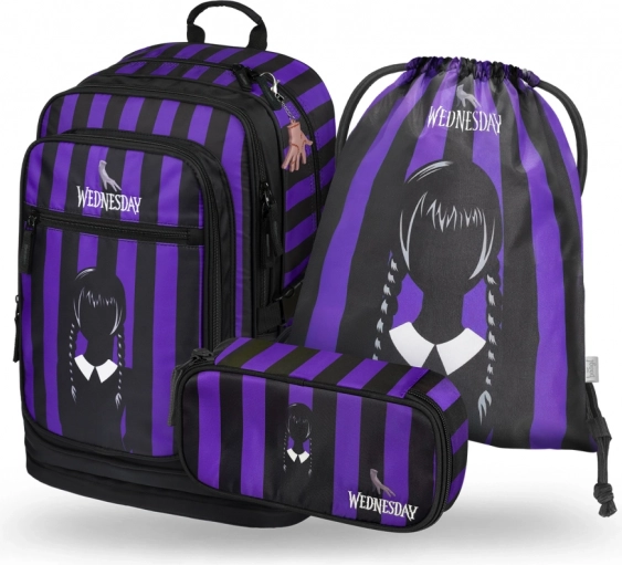 El set Cubic Wednesday incluye una mochila elegante, un estuche práctico y una bolsa para calzado, todo con un diseño moderno de rayas negras y moradas. La mochila está diseñada para satisfacer necesidades ergonómicas, mientras que el estuche y la bolsa garantizan la organización del material escolar y las actividades de ocio.