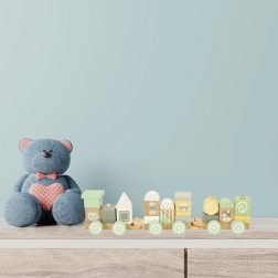 Piezas de madera suavemente lijadas con colores pastel no tóxicos y estampados de animalitos que resisten años de juego.