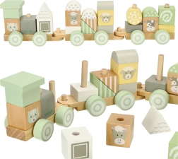 El set contiene 22 elementos de madera, incluidos 3 chasis, que los niños pueden combinar y montar libremente para crear trenes originales.