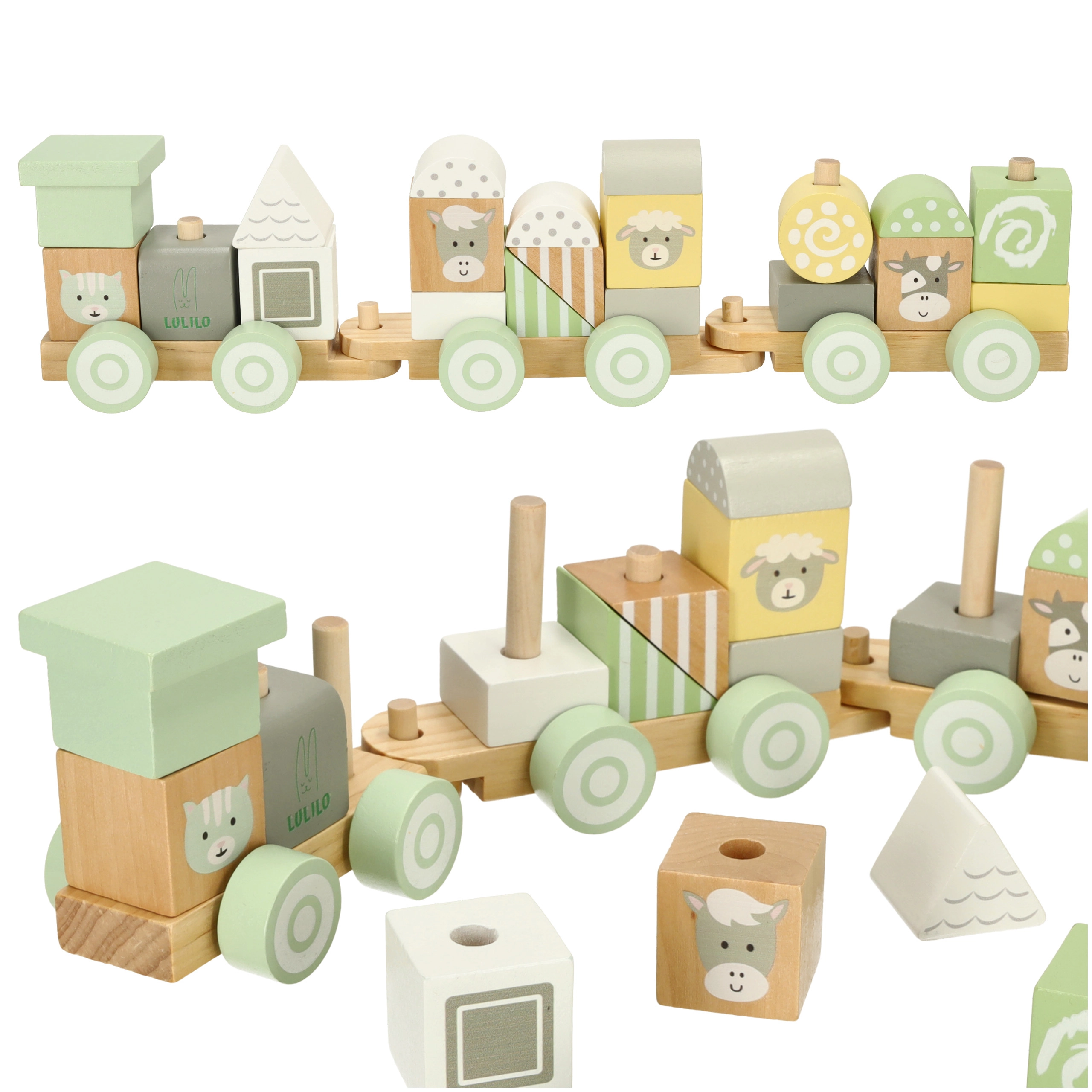 El tren de madera pastel LULILO es el juguete ideal para pequeños constructores. Los niños pueden combinar los bloques libremente y crear nuevas composiciones, o usar las piezas por separado. Cada pieza está finamente lijada y pintada con colores no tóxicos en tonos suaves, complementados con adorables motivos de animales.