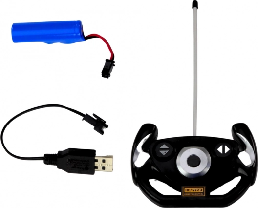 El coche se alimenta con una batería recargable de 1.5V 500mAh incluida en el set. El paquete también incluye un cargador. El mando funciona con dos pilas 1.5V AA, que no están incluidas.