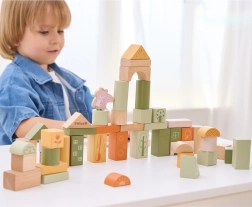 Las variadas formas y tamaños permiten a los niños construir torres, casitas y puentes, desarrollando de forma natural la motricidad fina y la paciencia.