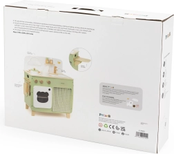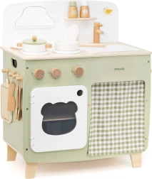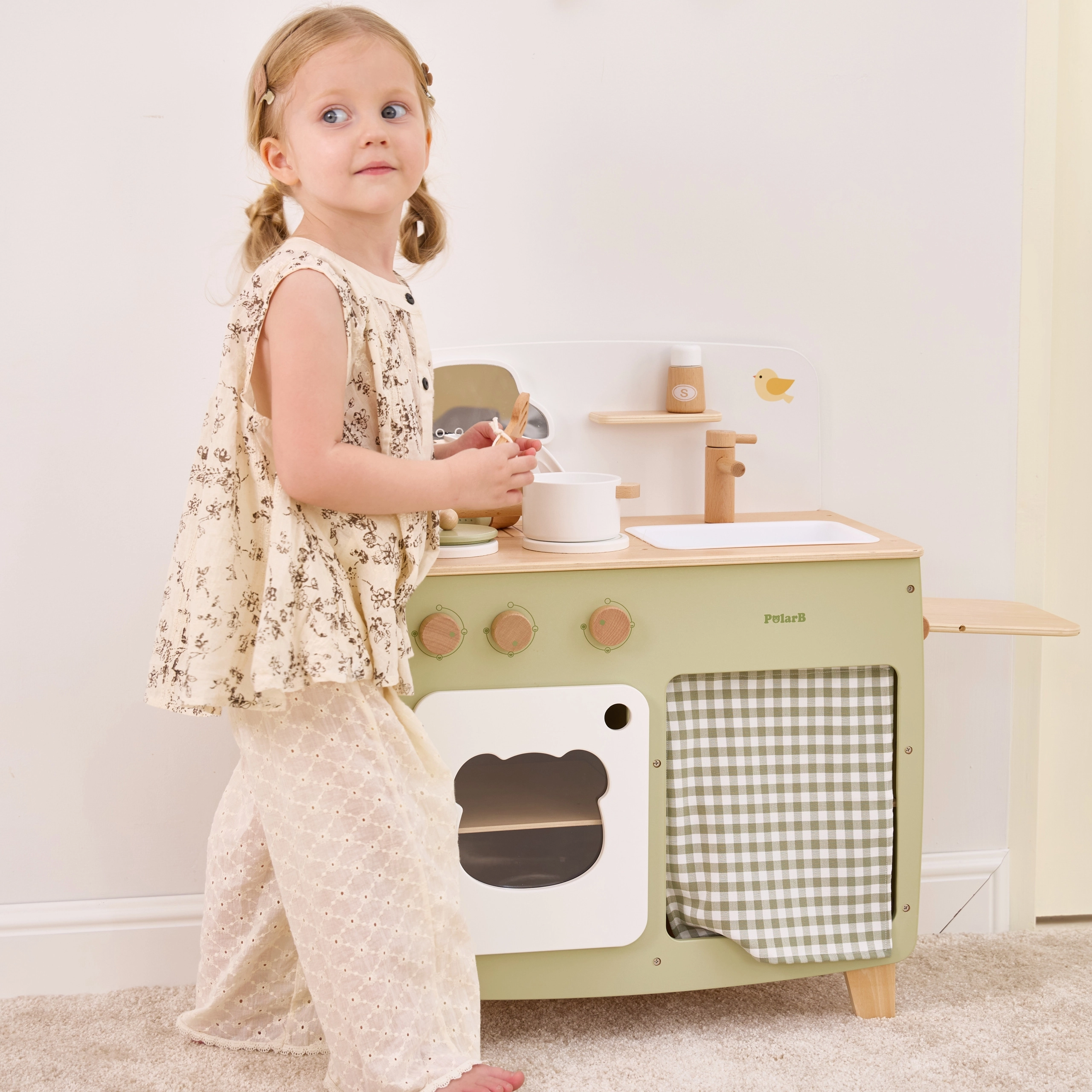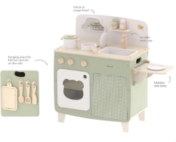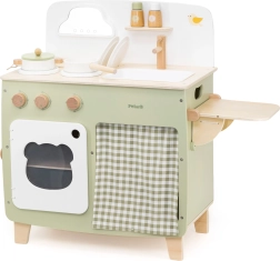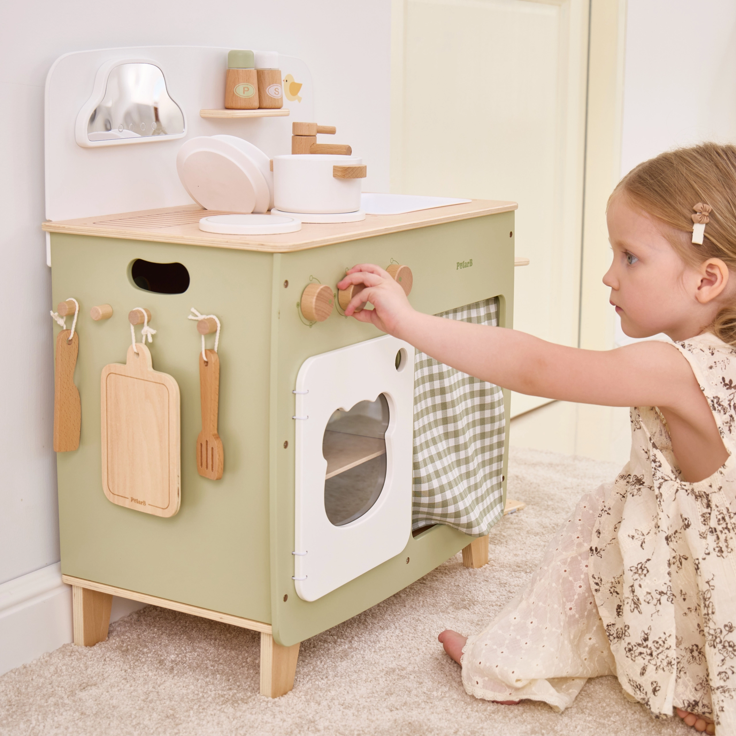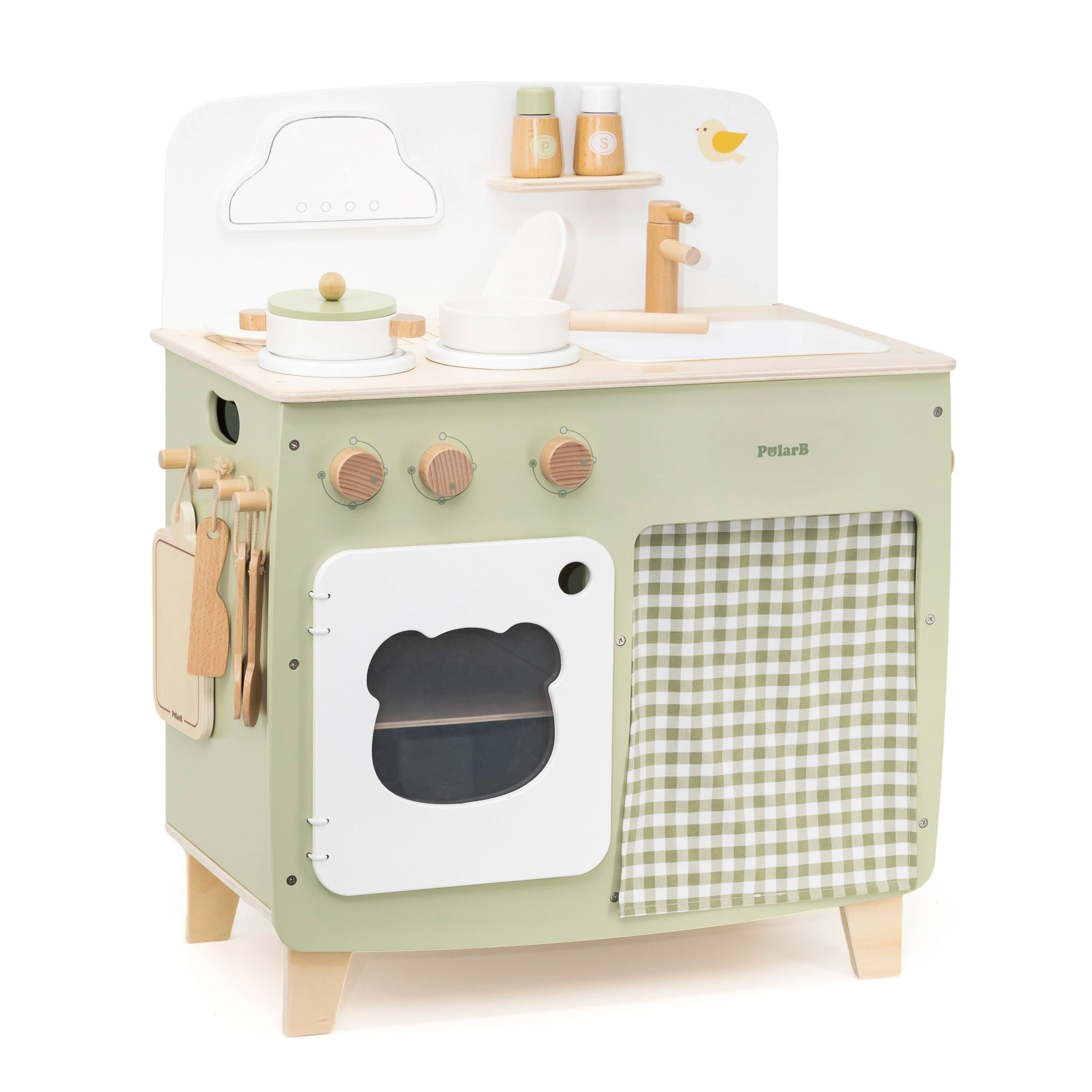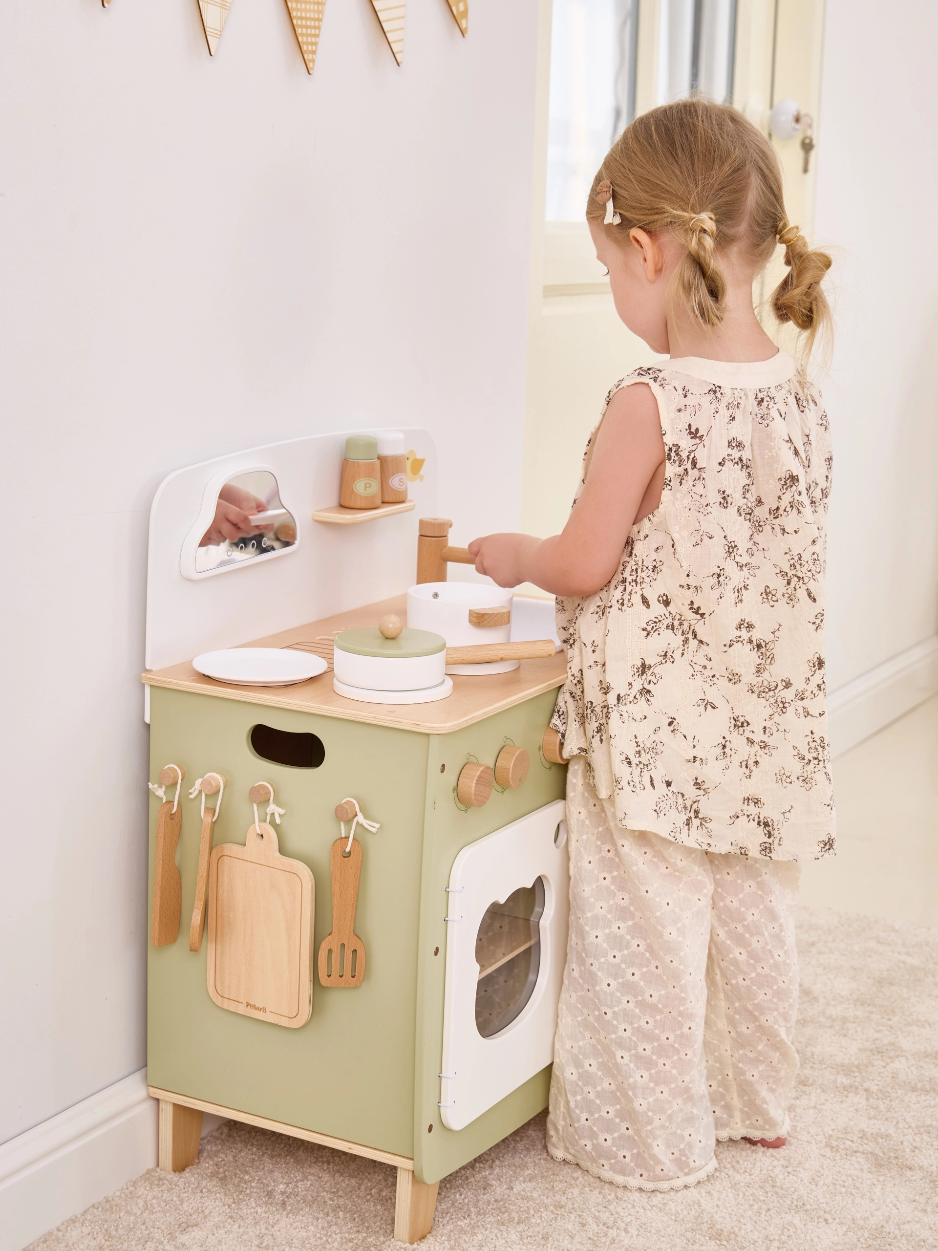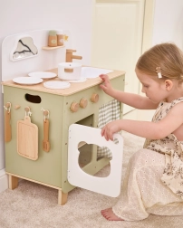 Una cocina infantil con estilo en agradables tonos naturales y verdes que ofrece a los peques una experiencia culinaria realista. Gracias a su robusta estructura de madera, los mandos giratorios, el fregadero y el horno, los pequeños chefs disfrutarán de horas de juego seguro y creativo. El práctico mostrador lateral abatible amplía la superficie para cortar o comer, mientras que el armario con cortina guarda todos los tesoros.