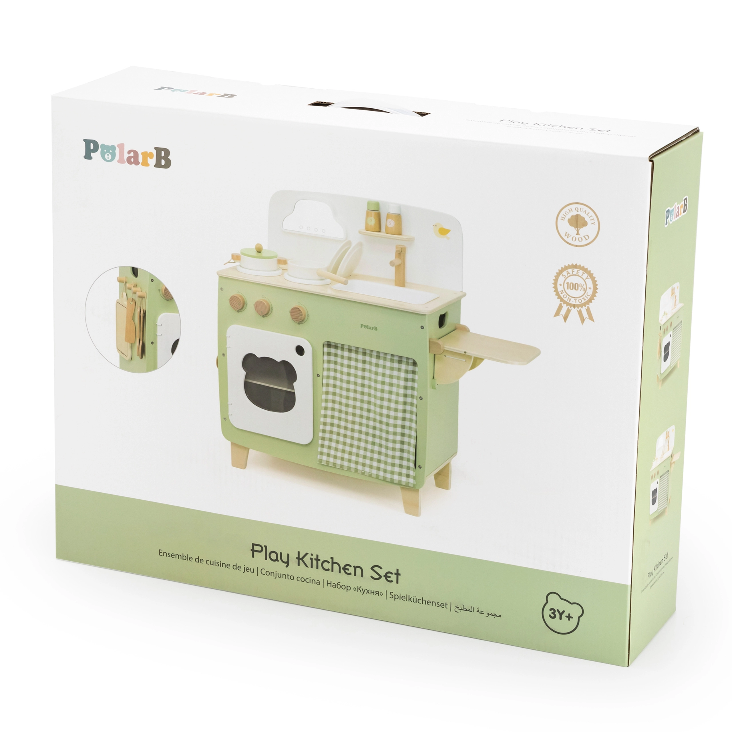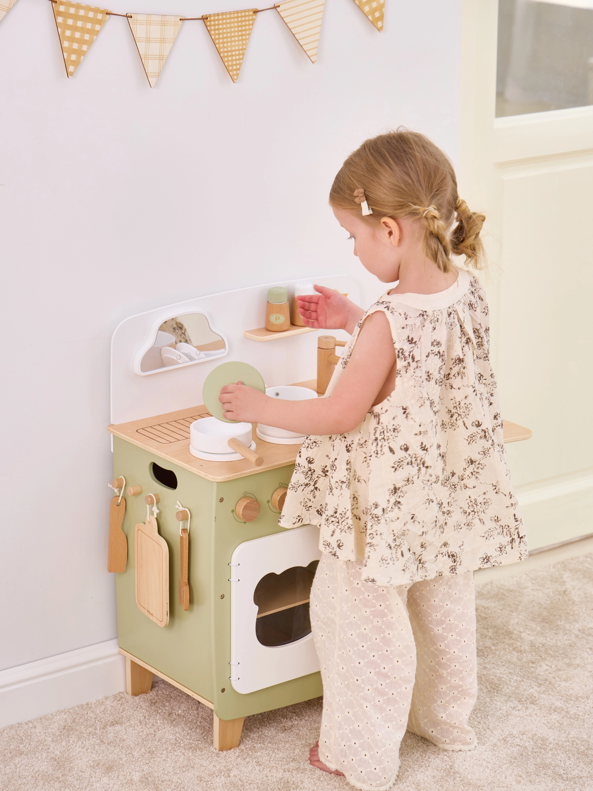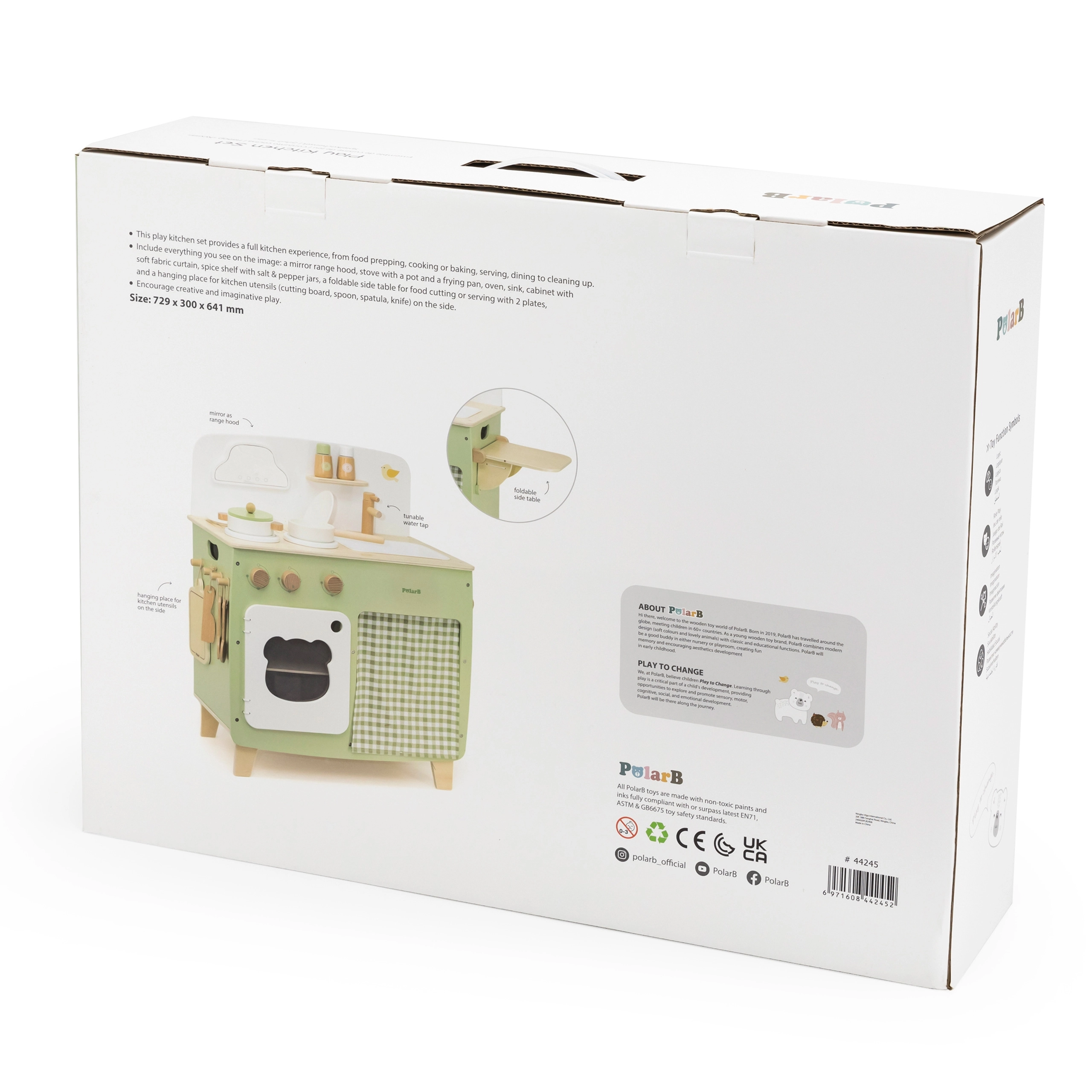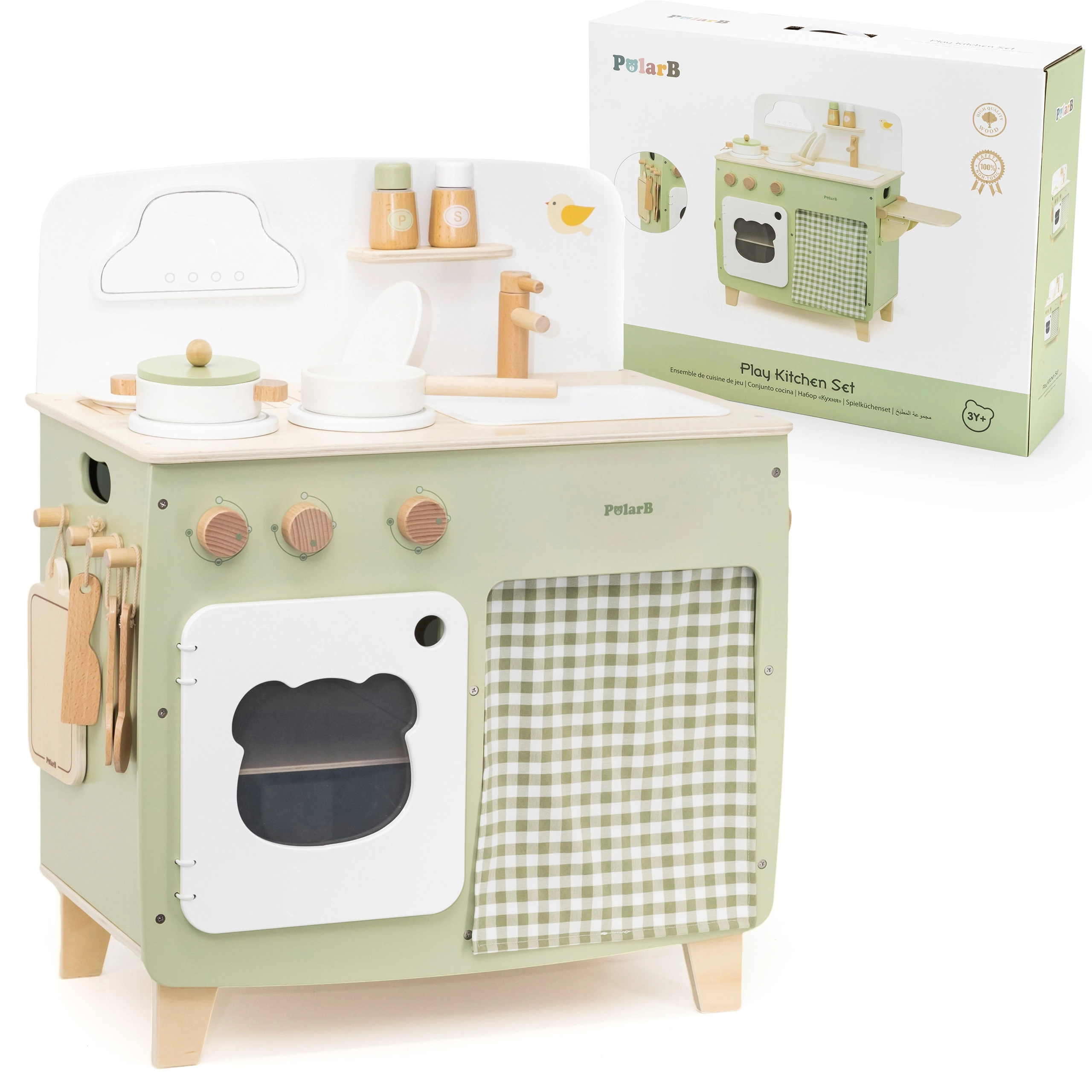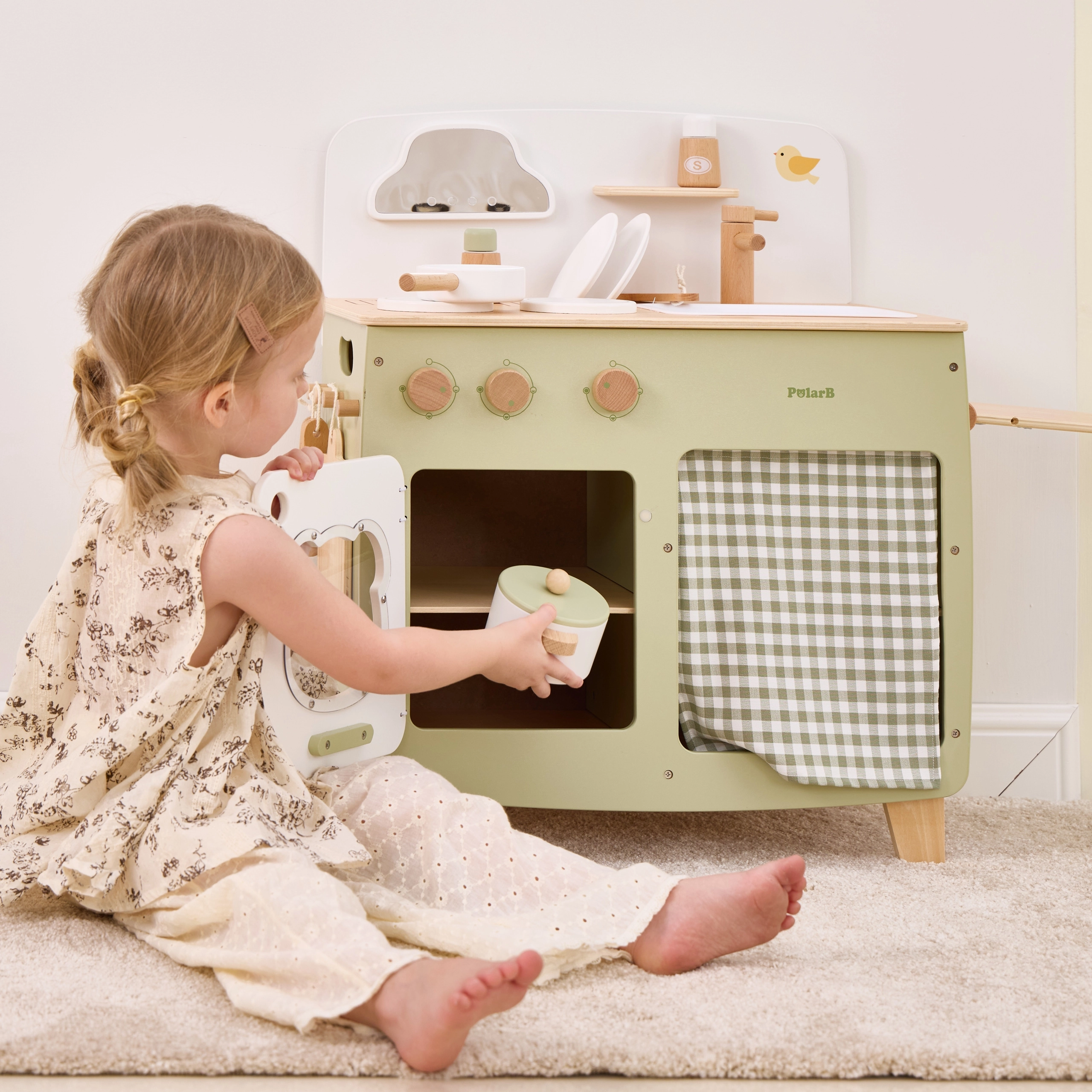 Una cocina infantil con estilo en agradables tonos naturales y verdes que ofrece a los peques una experiencia culinaria realista. Gracias a su robusta estructura de madera, los mandos giratorios, el fregadero y el horno, los pequeños chefs disfrutarán de horas de juego seguro y creativo. El práctico mostrador lateral abatible amplía la superficie para cortar o comer, mientras que el armario con cortina guarda todos los tesoros.