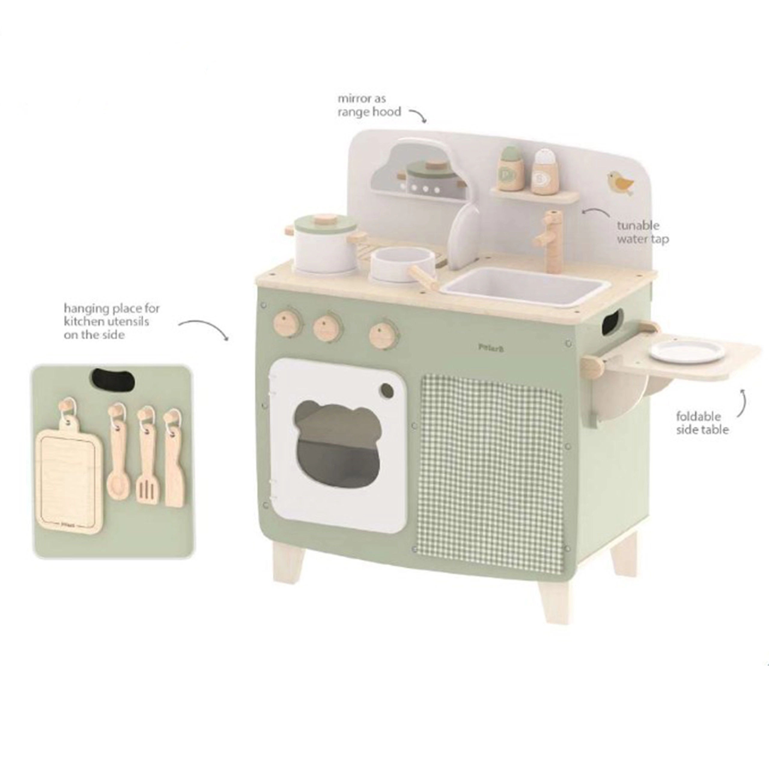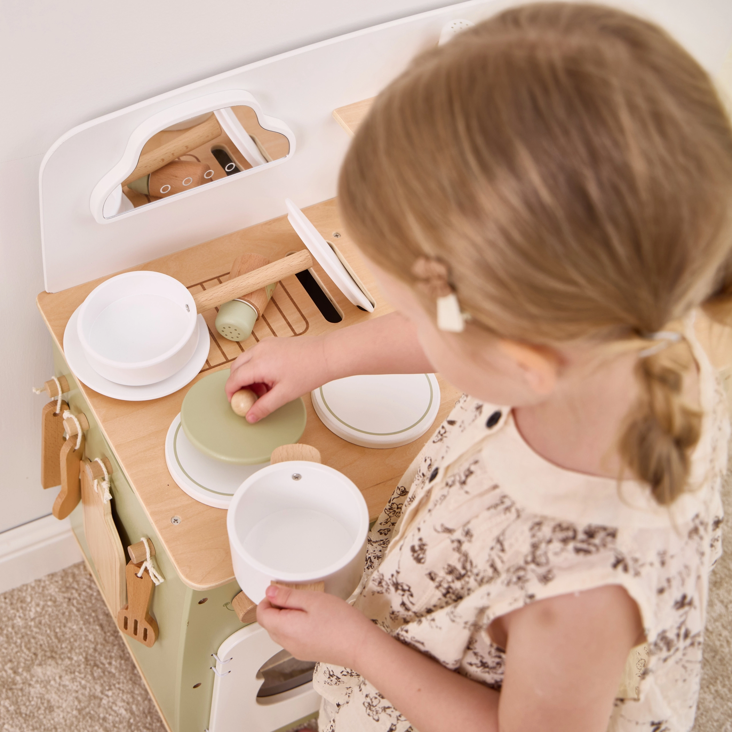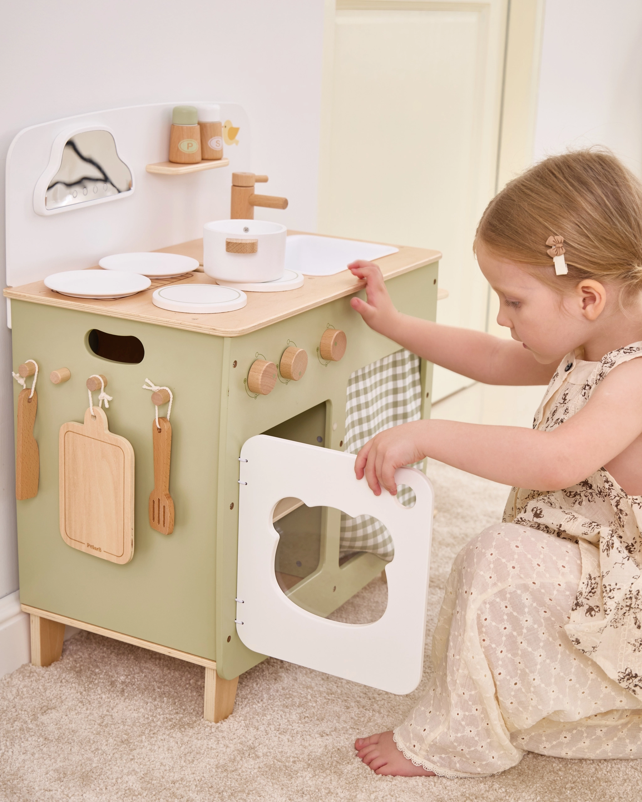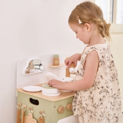 Los mandos giratorios de la placa y el horno, el fregadero con grifo, los ganchos para utensilios y los especieros fomentan el juego de imitación y la motricidad fina.