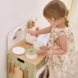 Incluye olla, sartén, platos, especieros, ganchos para utensilios y repisa para condimentos. La cocina fomenta la responsabilidad y la autonomía: tras jugar, los niños pueden ordenar fácilmente la vajilla en su lugar. Gracias a su diseño bien pensado, es fácil de montar y totalmente segura para niños a partir de 3 años.