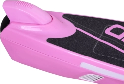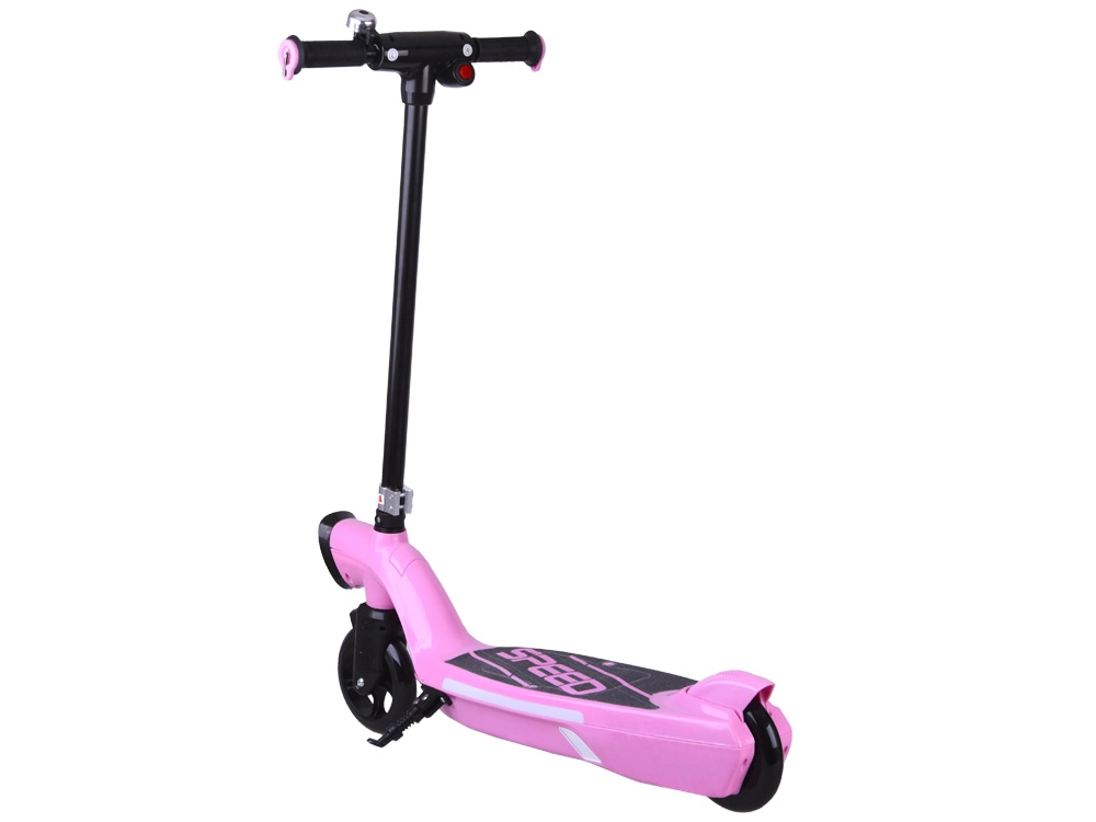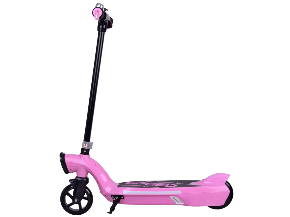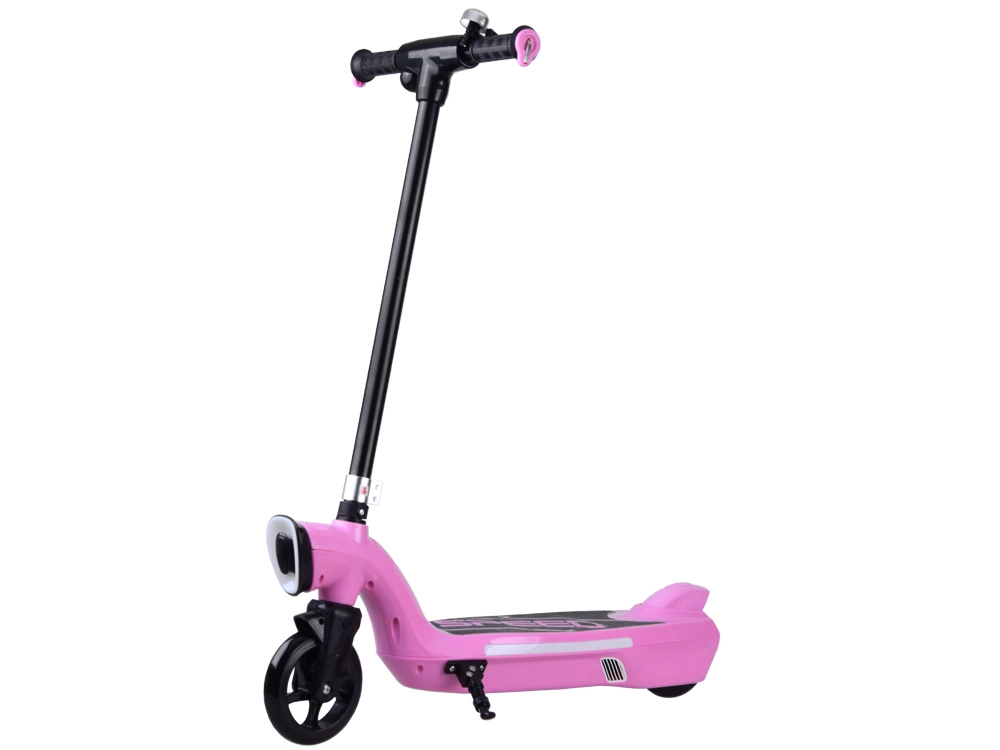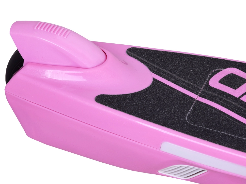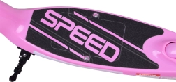 La construcción robusta con tabla antideslizante “SPEED”, puños de goma, timbre y doble sistema de frenado (eléctrico al soltar el gatillo y mecánico de pie) proporcionan control y confort. El scooter es compacto y cabe fácilmente en el maletero del coche o en el apartamento.