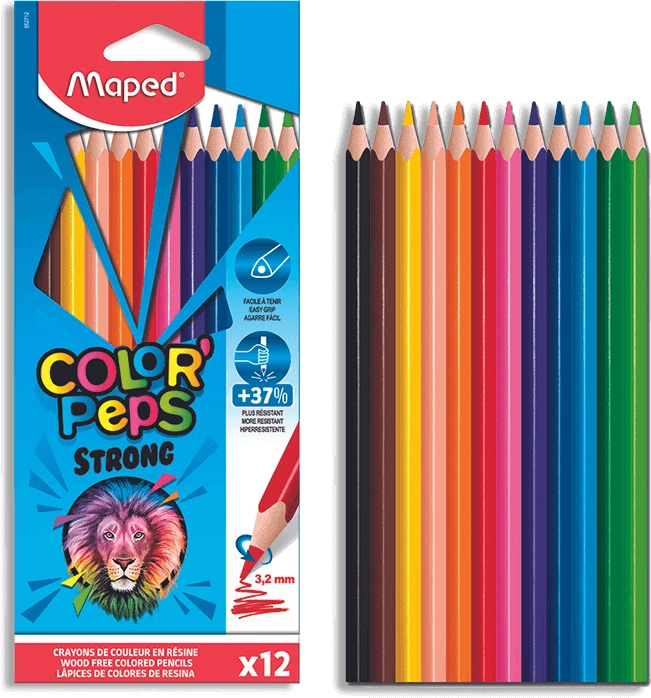 Lápices de colores Maped Color'Peps Strong ofrecen colores intensos y brillantes con una mina extraordinariamente resistente. Adecuados para niños gracias al cuerpo triangular, que garantiza un agarre cómodo.