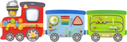 La locomotora roja destaca por sus engranajes giratorios y la rueda de molino, que enseñan a los niños la relación causa-efecto. El espejo seguro favorece la percepción visual y el autoconocimiento.