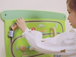La vía de tren interactiva con pequeños vehículos y los bloques giratorios con motivos de monumentos desarrollan el pensamiento lógico, la imaginación y la motricidad fina.