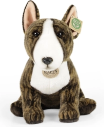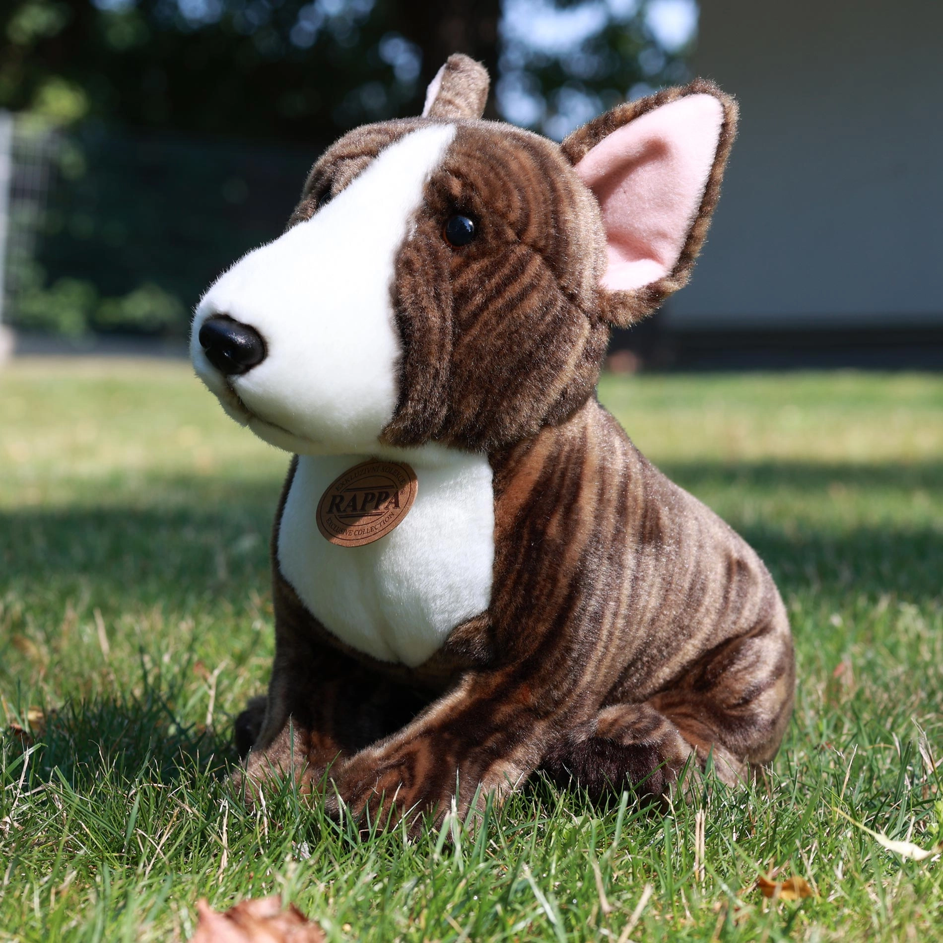 Adorable perro de peluche bull terrier inglés de 30 cm de la colección RAPPA que alegrará a niños y adultos. Está hecho de un peluche de alta calidad y suavidad, y cuenta con acabado realista, trabajo manual y relleno eco‑friendly de botellas PET recicladas, seguro incluso para los más pequeños.