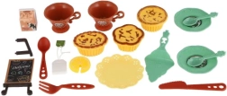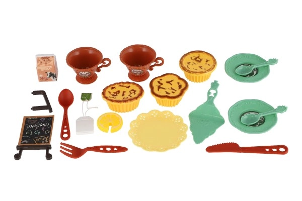 El set incluye tazas, platillos, cubiertos, un pequeño postre y una pizarra con inscripción: todo preparado para servir con estilo y fomentar el juego social.
