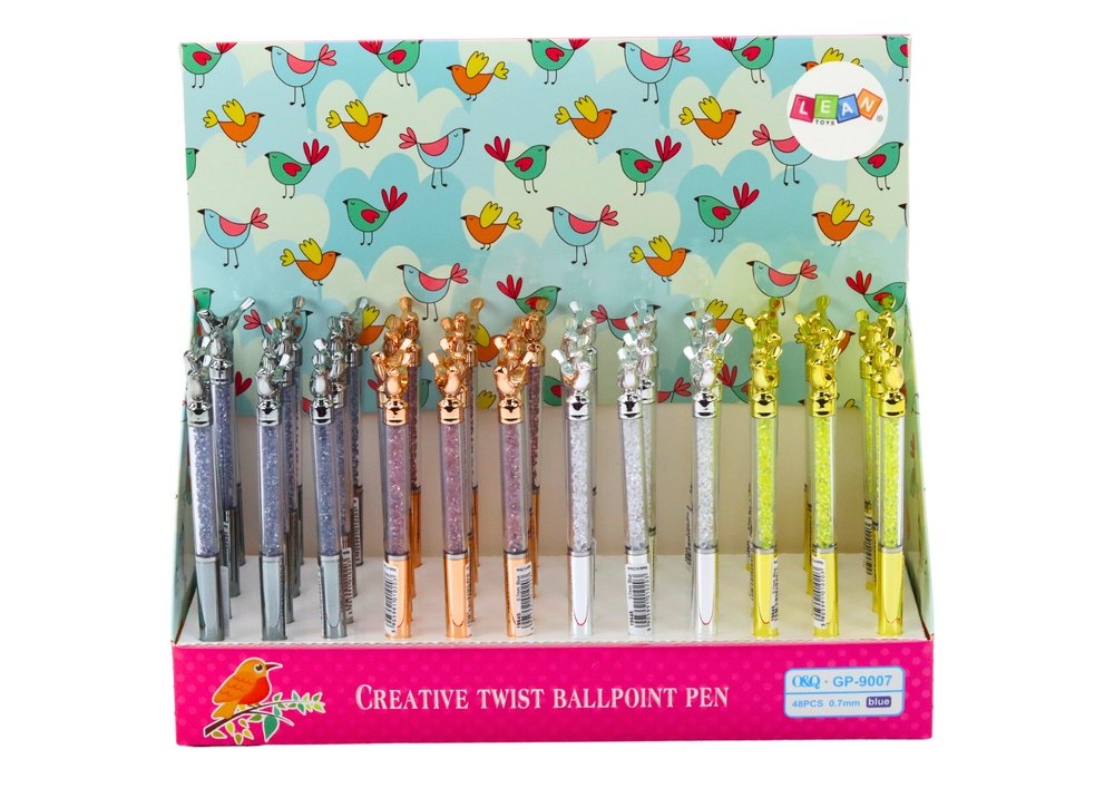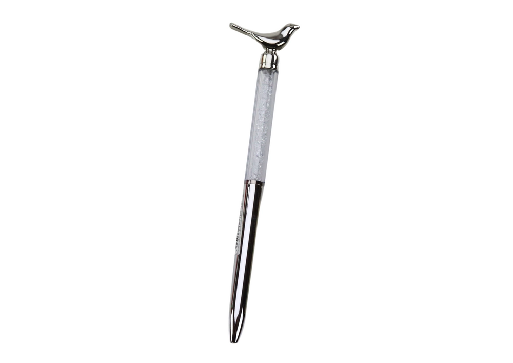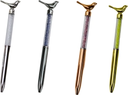 Este bolígrafo con estilo destaca por su original remate en forma de pajarito y la sección transparente rellena de pequeños cristales que centellean suavemente al moverlo. Ideal para la escuela, la oficina o como complemento para regalo.