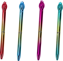Un bolígrafo elegante con cuerpo dorado y una piña decorativa en el extremo que combina elegancia y funcionalidad. Escribe con tinta azul de flujo suave y punta de 0,7 mm, ideal para notas diarias y como regalo. Disponible en acabado dorado con acentos de color: rosa, azul, rojo, verde.