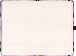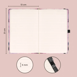 Elegante cuaderno rayado NOTIQUE Sakura en formato práctico de 13 × 21 cm con tapas rígidas, cierre con goma, lazo para bolígrafo y bolsillo interior. Ofrece 172 páginas de agradable papel amarillo para diario y notas de trabajo.