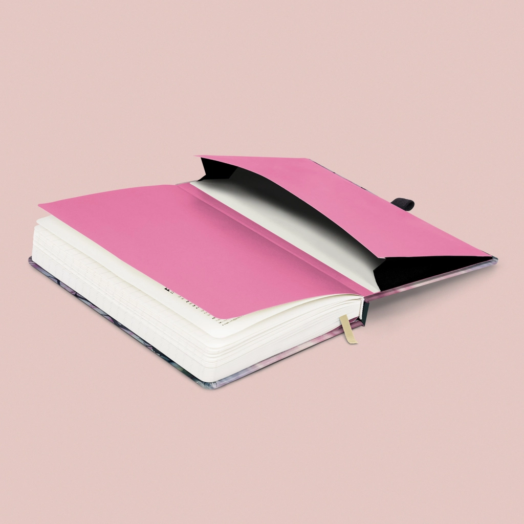 El cuaderno estiloso NOTIQUE con motivo sakura es ideal para la escritura cotidiana. Gracias a las tapas rígidas y al cierre con goma, el contenido se mantiene seguro, mientras que el lazo para bolígrafo y el práctico bolsillo interior facilitan la organización de objetos pequeños.