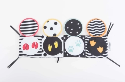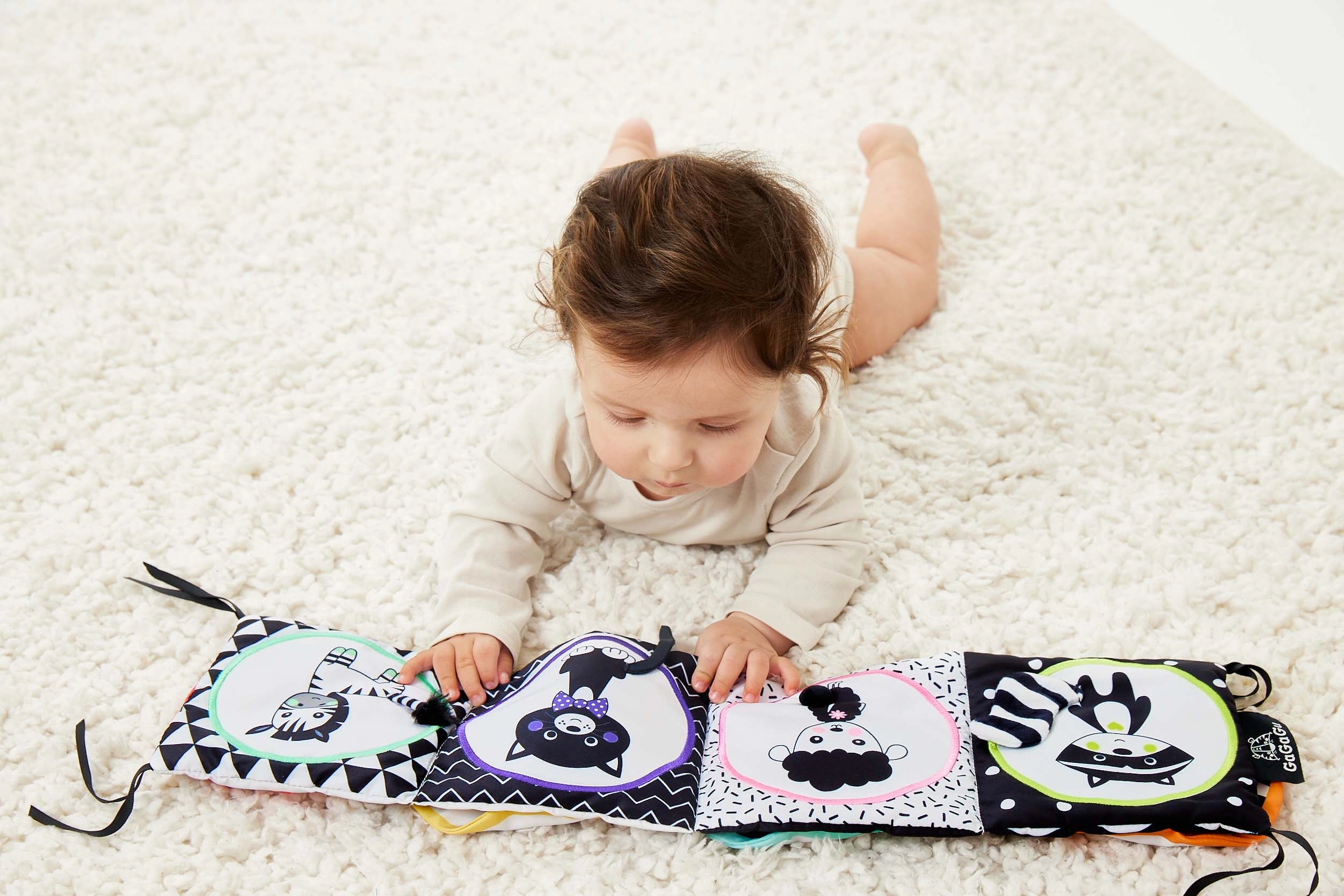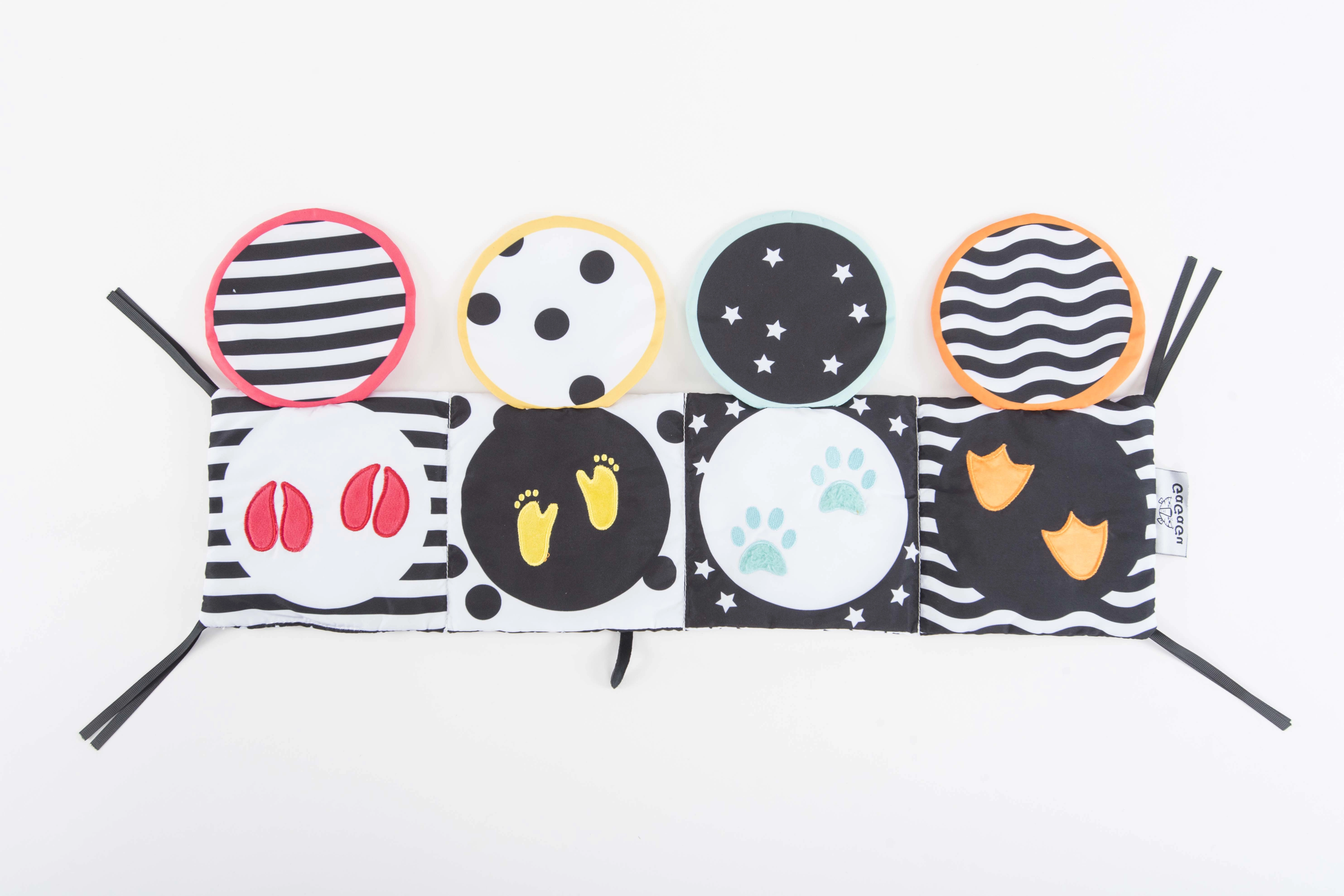 El libro de doble cara ofrece dos experiencias visuales diferentes gracias a los elementos bordados y a las ilustraciones en contraste de animales. Las solapas de felpa añaden otra dimensión de diversión; crujen al tocarlas y enseñan a los niños nuevas formas y colores.