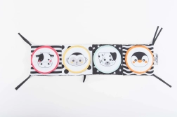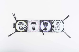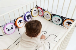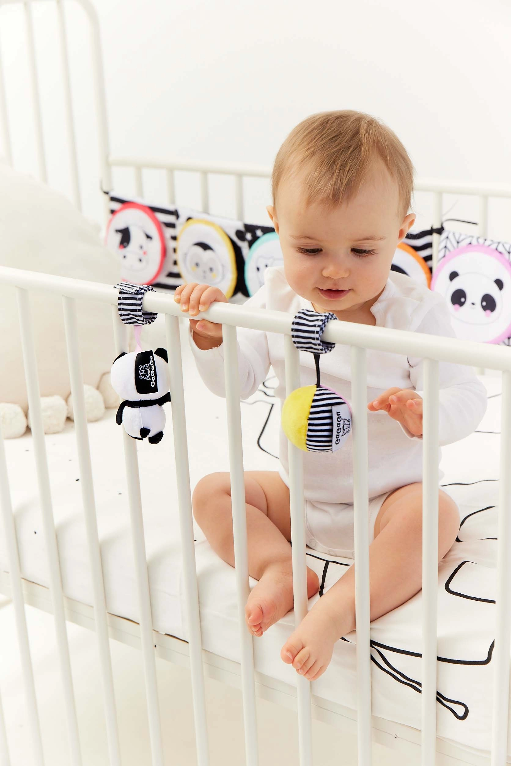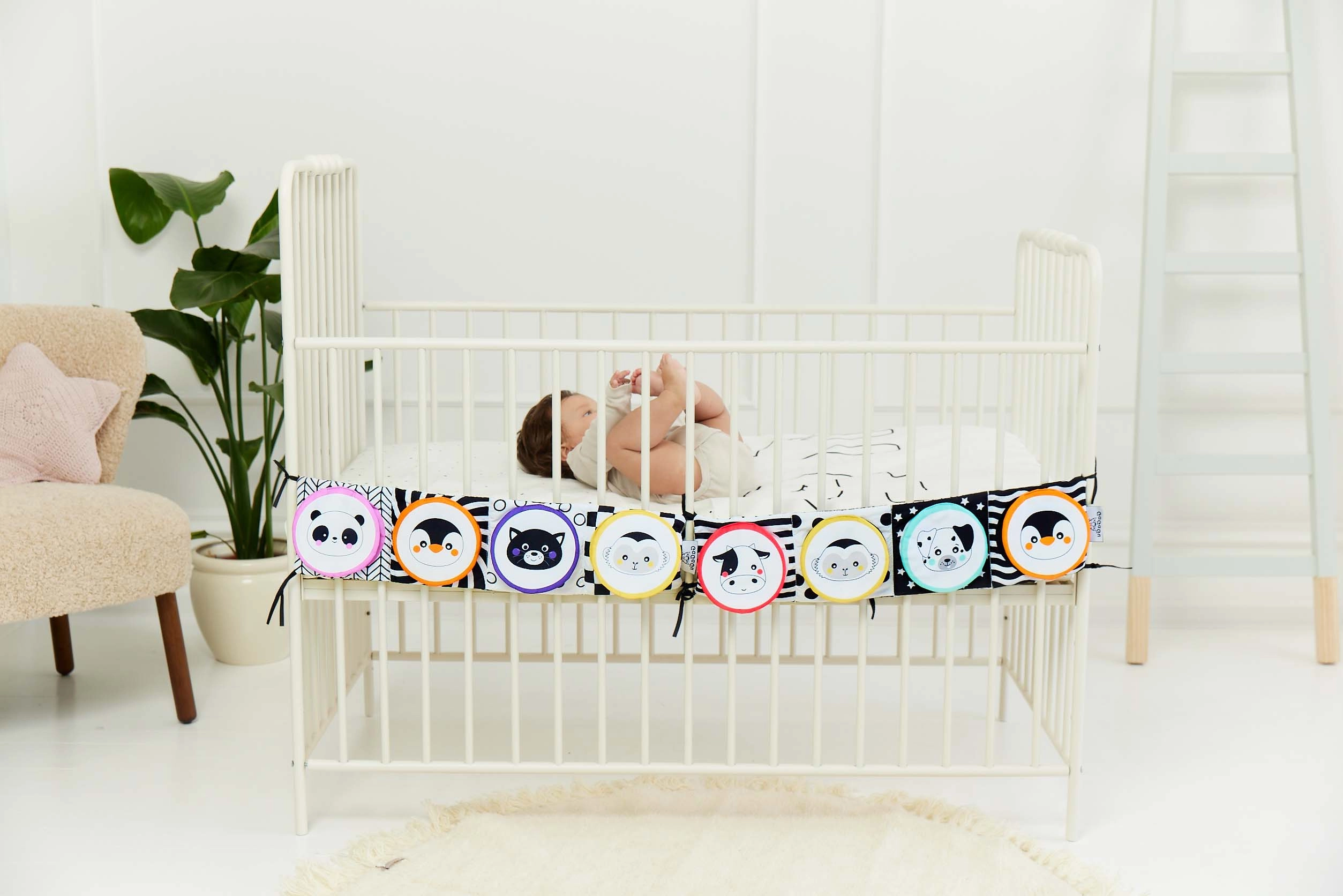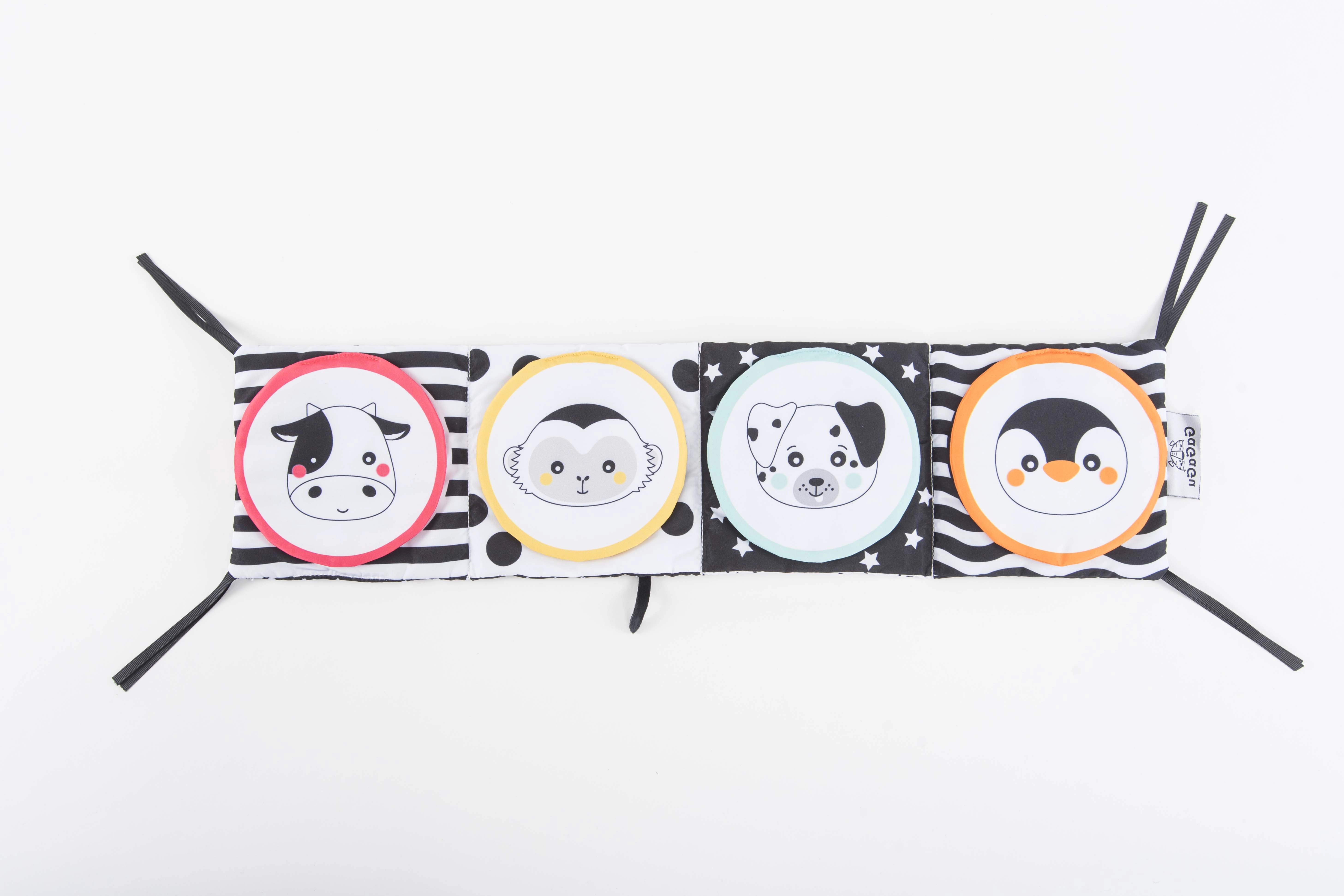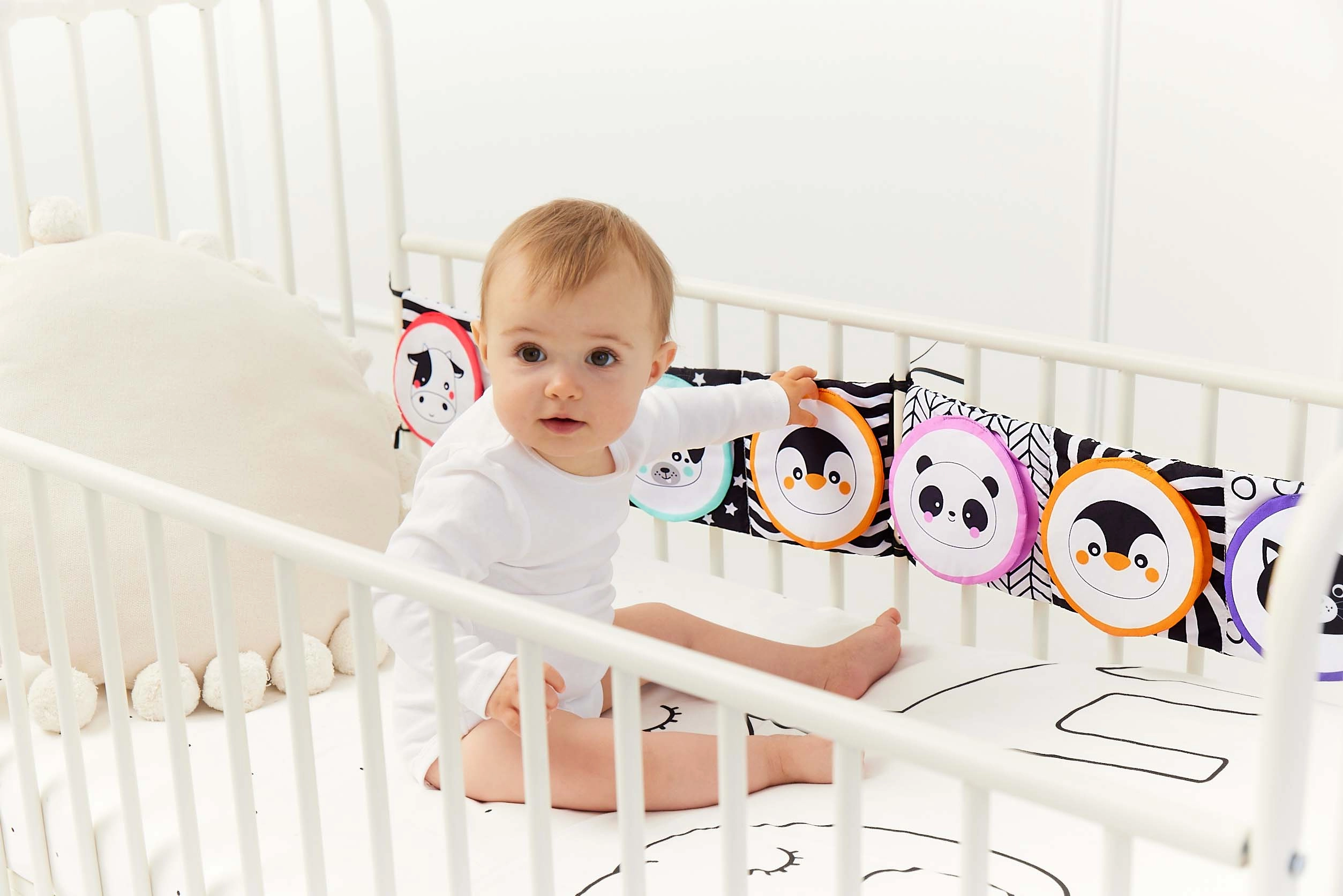 Se puede fijar fácilmente a la cuna o al carrito mediante cintas, y su estructura ligera lo hace ideal para viajes. Ayuda a desarrollar la vista y el tacto, junto con conocimientos básicos sobre los animales.
