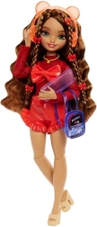 La muñeca tiene el cabello largo y castaño adornado con lazos rojos, lo que resalta su estilo único y su personalidad vibrante.