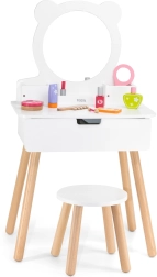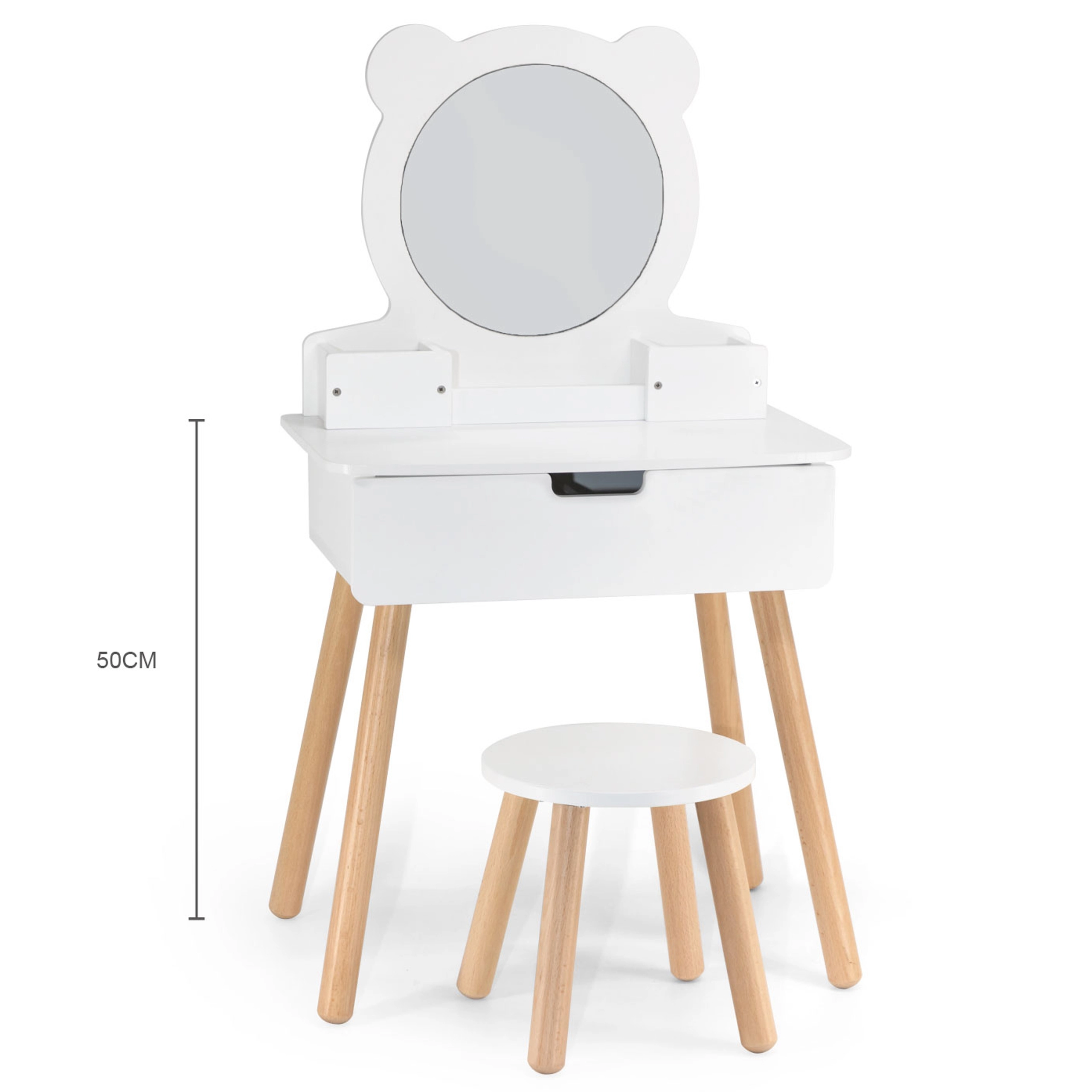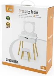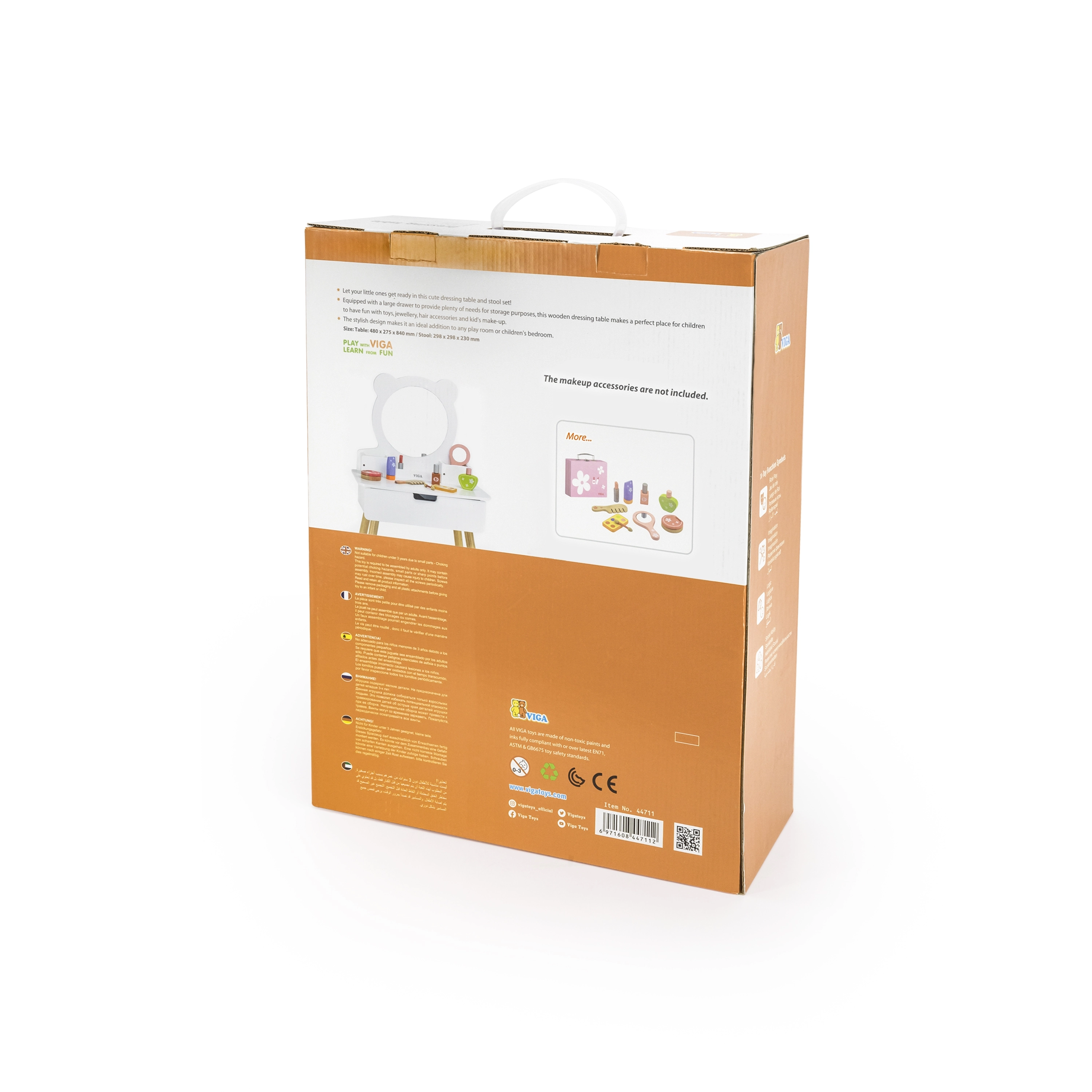 El tocador de la marca VIGA está equipado con un espejo de oso y cuenta con prácticos espacios de almacenamiento que animan a los niños al juego creativo. El mueble tiene patas de madera y un elegante color blanco que encantará a cualquier pequeña dama.