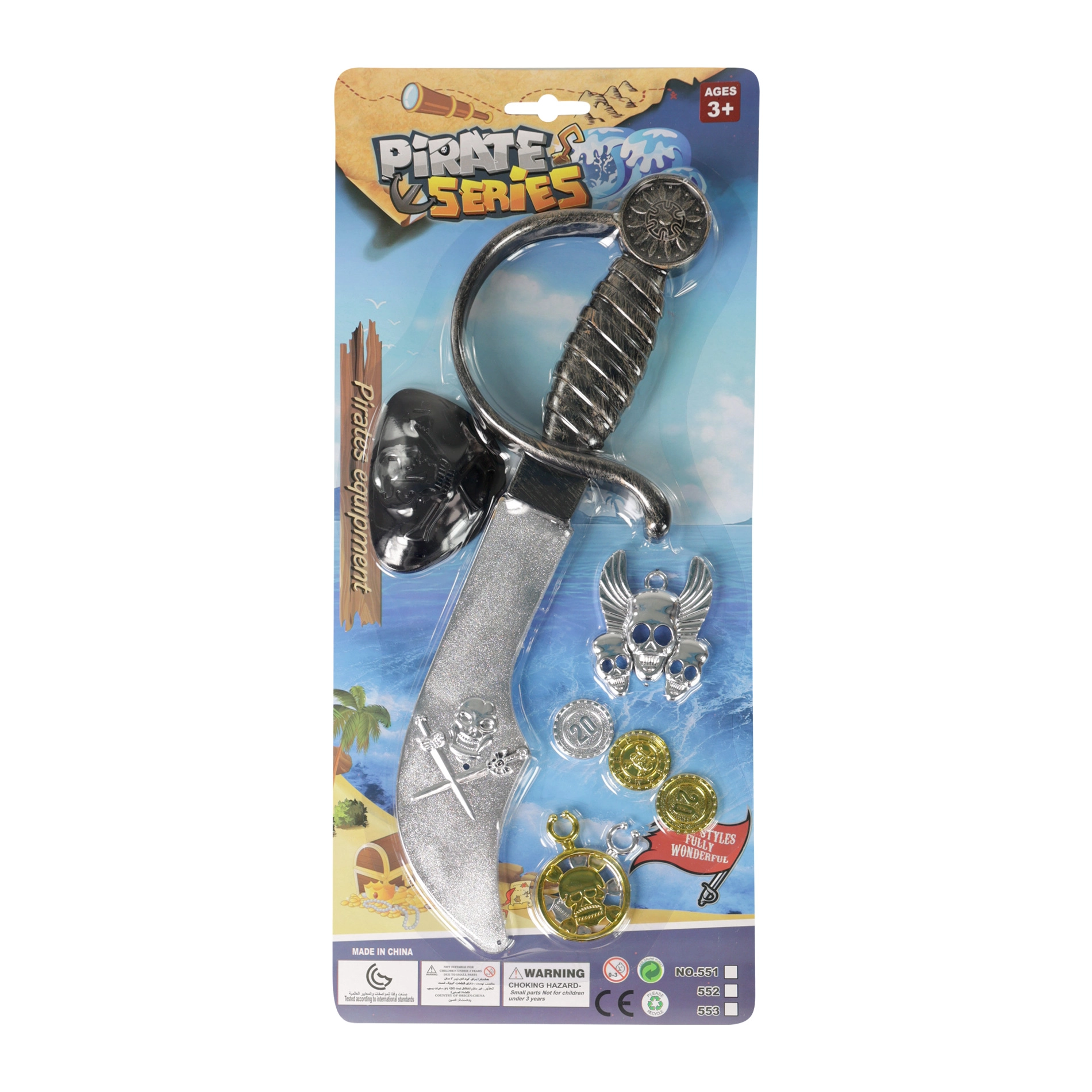 - Espada pirata de plástico, parche para el ojo, accesorios piratas (colgantes/fichas)