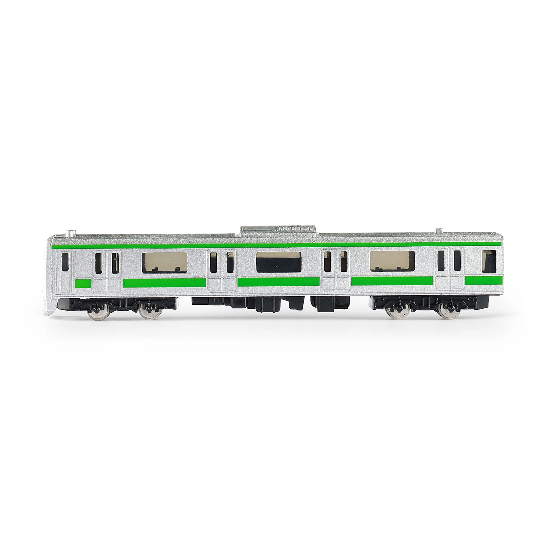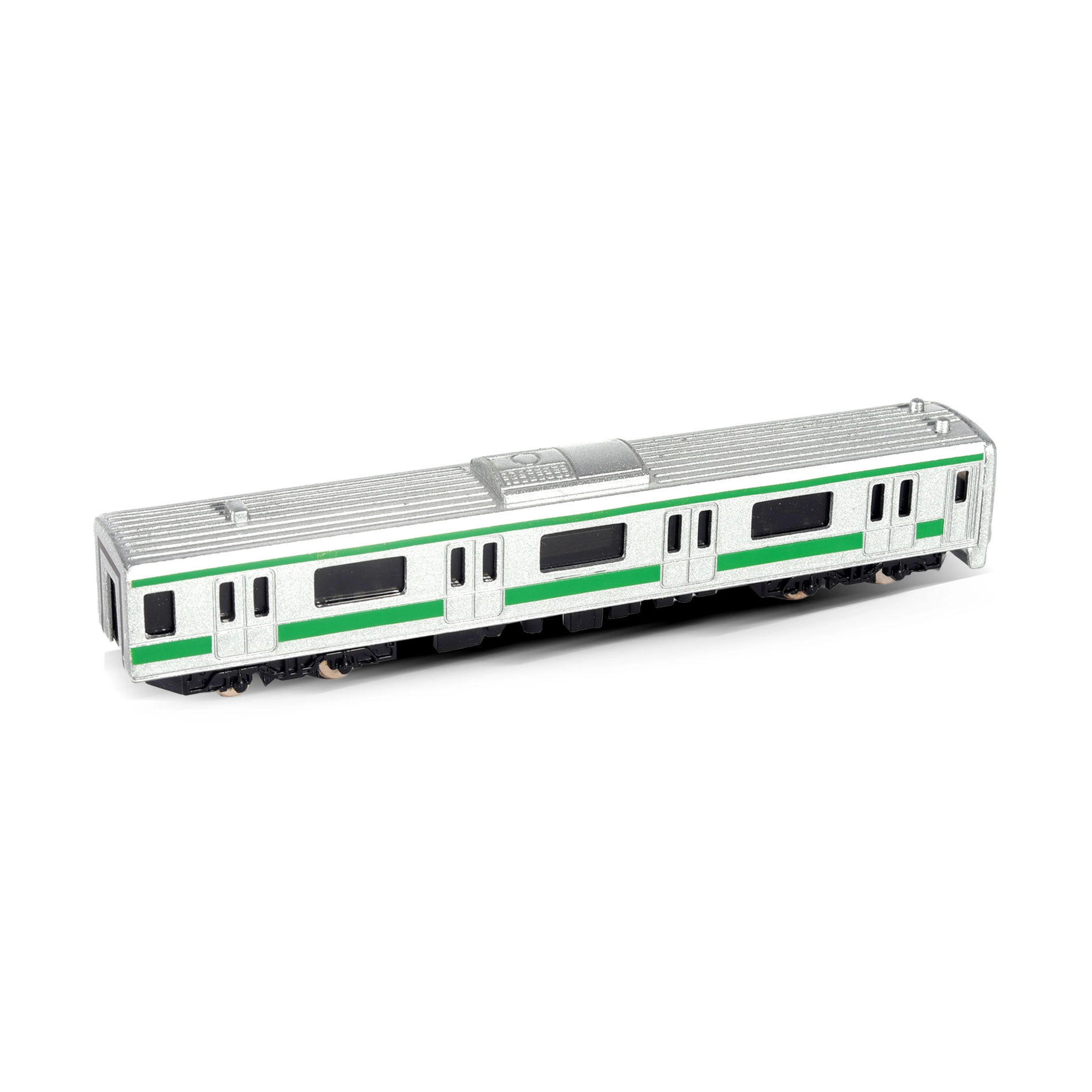 Carrocería plateada con franjas verdes, ventanas y puertas detalladas: el modelo luce como un auténtico vagón de metro a escala 1:48.