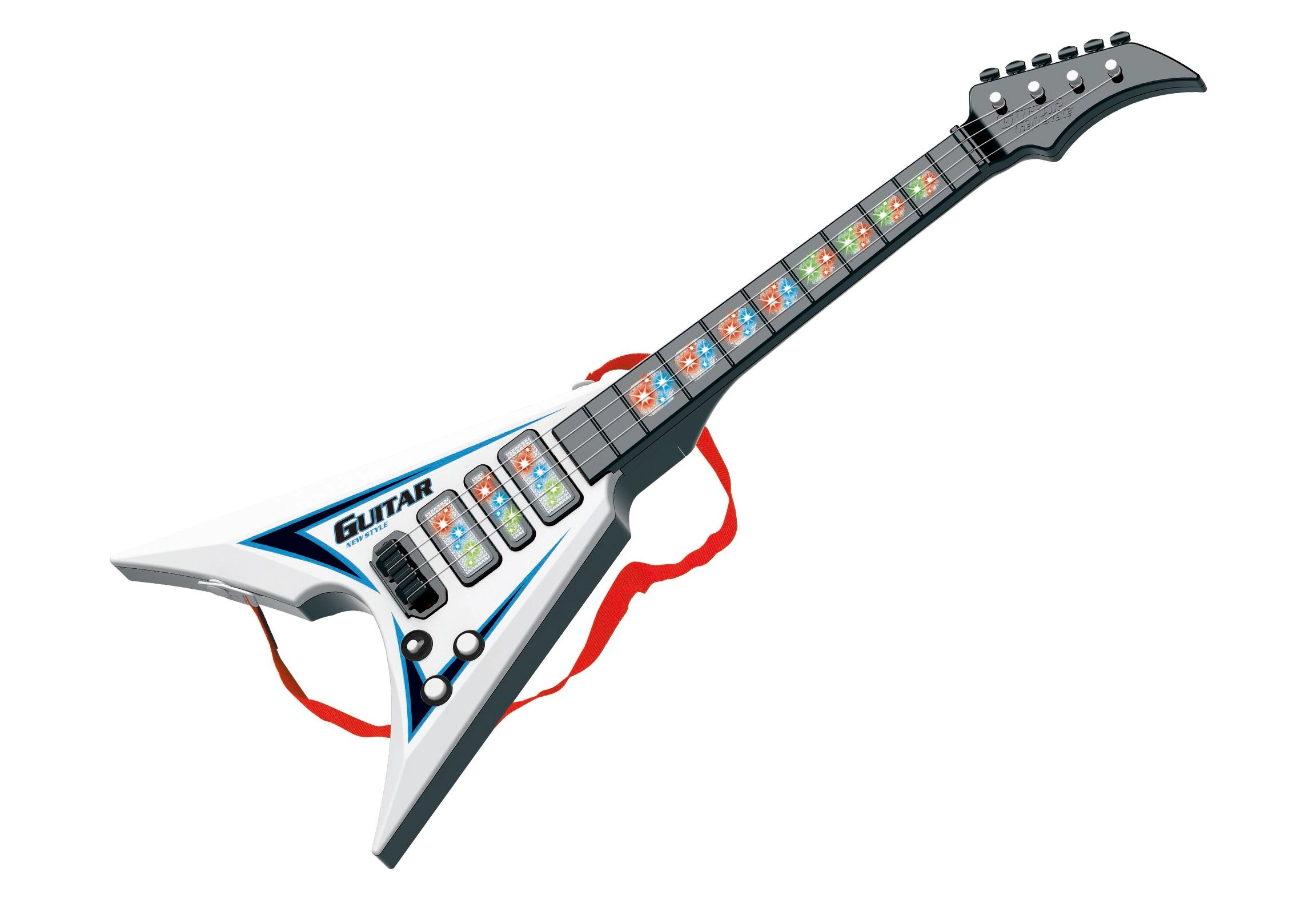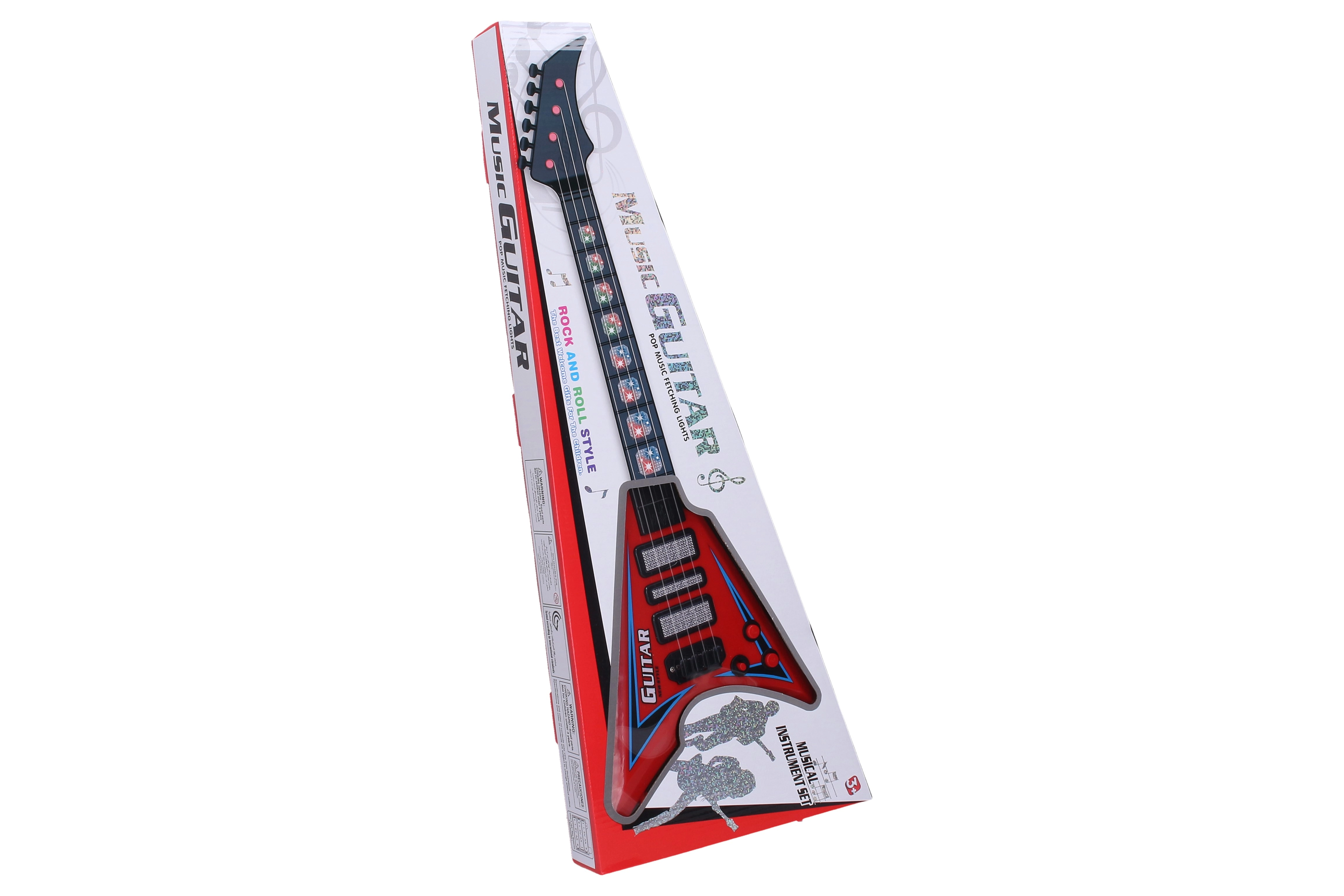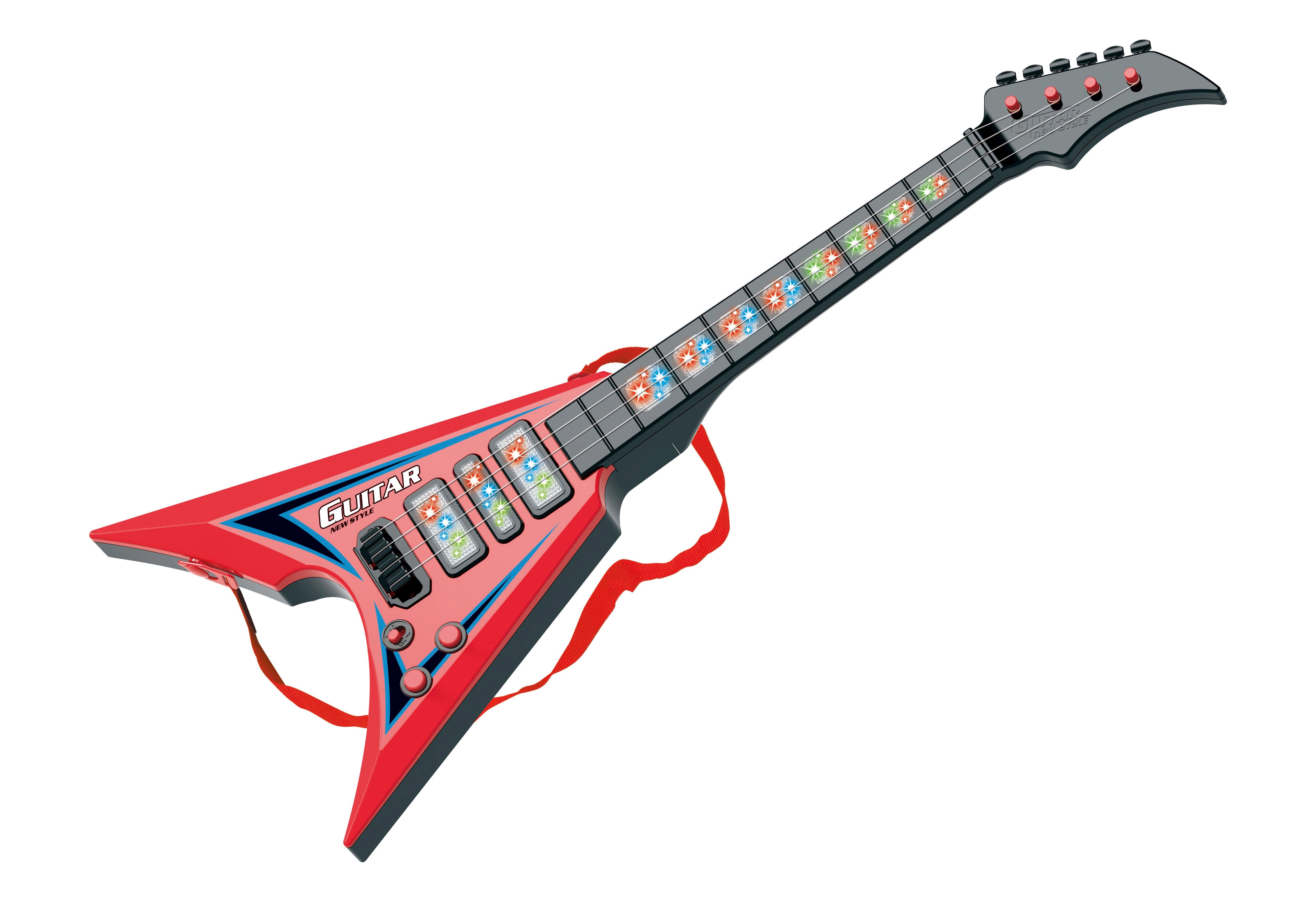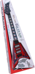 Esta guitarra eléctrica es ideal tanto para principiantes como para avanzados gracias a sus dimensiones de 22x5x56 cm. Cuenta con efectos de luz y sonido que crean una experiencia única al tocar. Alimentación con tres baterías AA, no incluidas en el paquete, y manejo sencillo gracias al interruptor ON/OFF junto a los potenciómetros. Ambos potenciómetros sirven para controlar los efectos.
