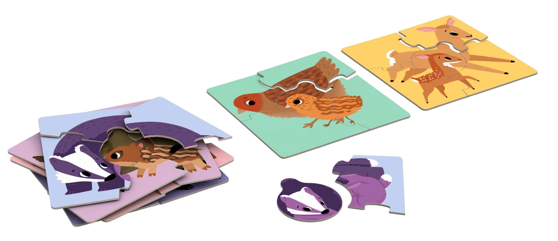 Este set incluye seis rompecabezas cuadrados con ilustraciones de familias de animales: oso, zorro, tejón, jabalí, corzo y pajarito. Cada motivo se compone de cuatro piezas grandes con un tamaño final de aprox. 15,5 × 15,5 cm. Las mismas formas de los encajes de conexión llevan a los niños a probar de manera sistemática y a una correcta asignación; además, las piezas centrales de las crías tienen la misma forma en todos los motivos.
